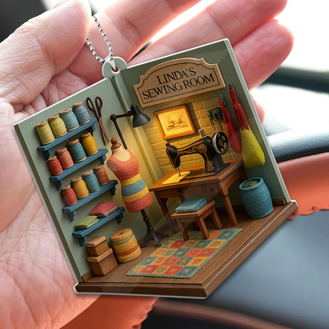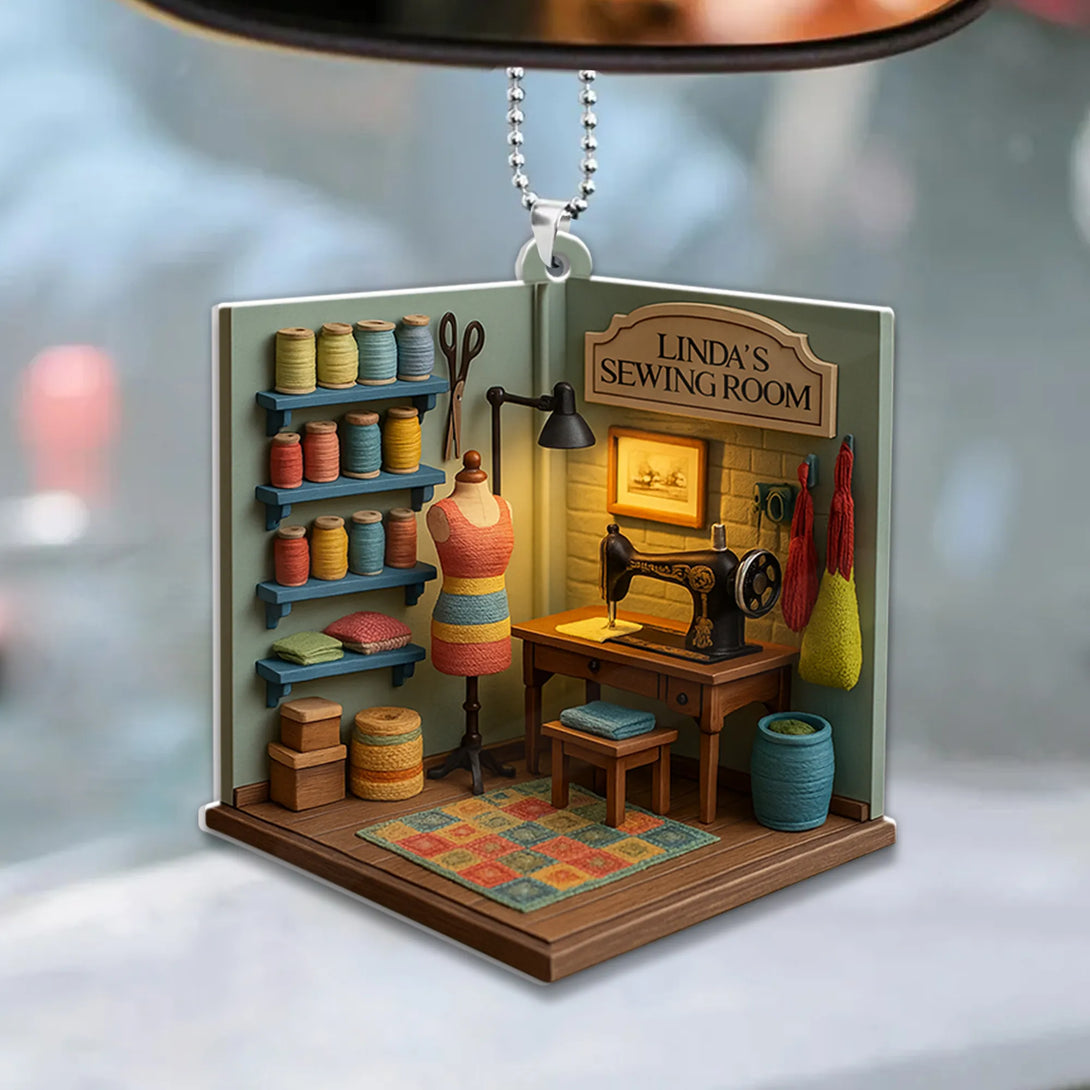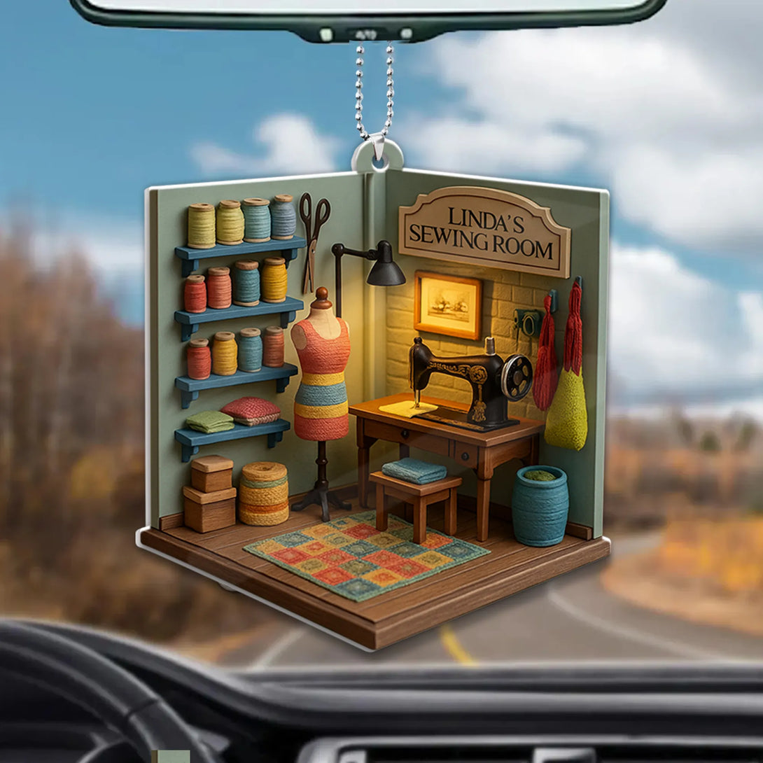 Bring warmth and creativity to your ride with this charming sewing room-themed car ornament! Designed to resemble a cozy sewing space complete with spools, scissors, mannequin, and a vintage sewing machine, this ornament is the perfect accessory for sewing lovers, quilters, or anyone who adores handmade crafts.