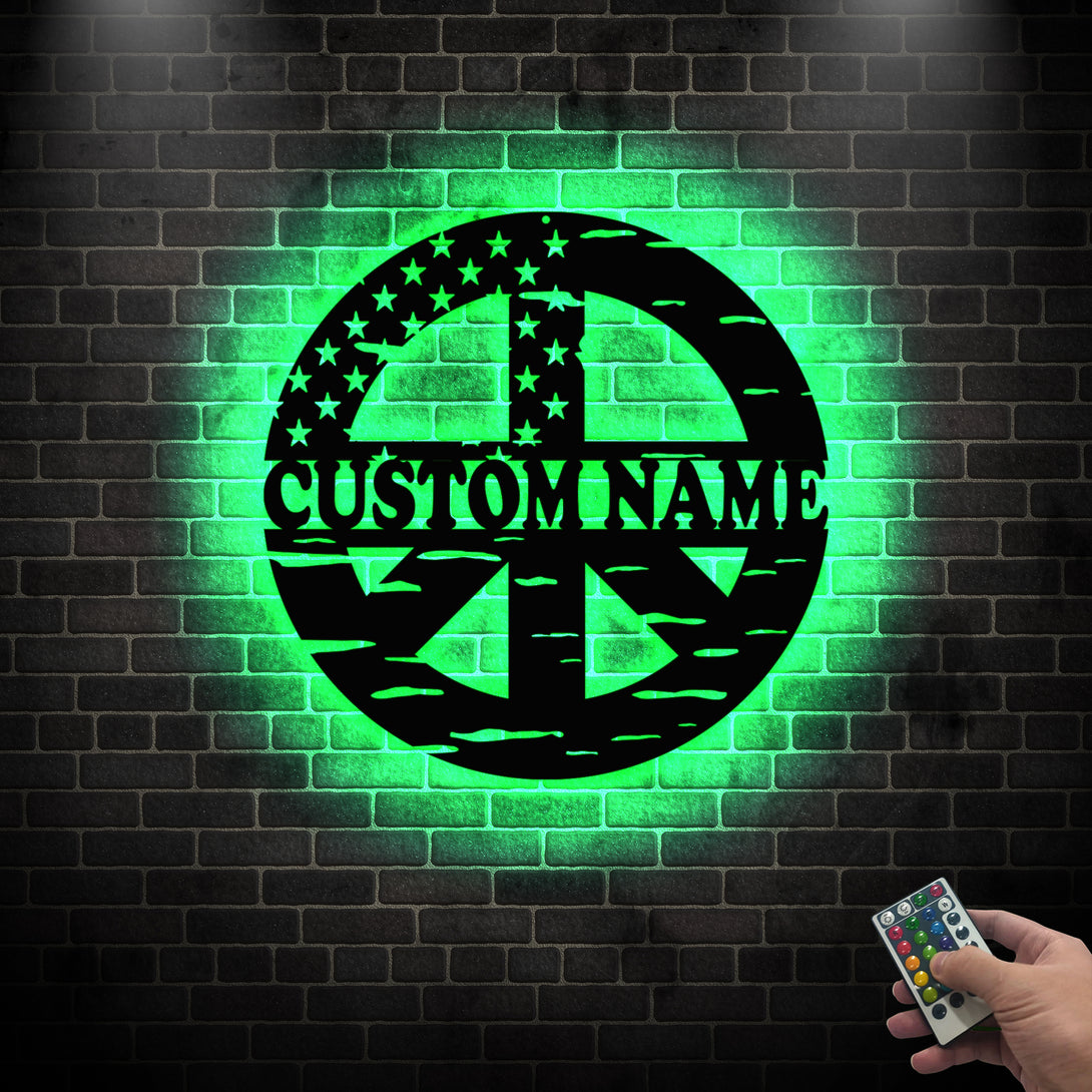 Custom Name American Flag Metal Peace Symbol Sign With Led Lights, Us Stars & Stripes Peace Symbol Metal Wall Art, American Flag Metal Peace Sign