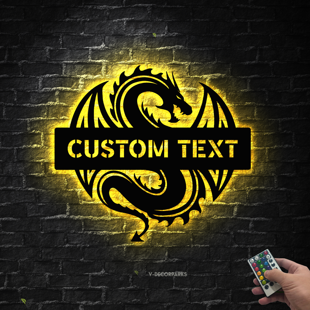 Custom Name Mythical Dragon Metal Sign With Led Lights, Personalized Mythology Dragon Metal Wall Art, Dragon Tattoo Metal Sign Art Home Decor