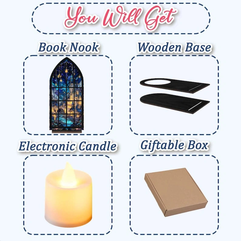 Turn your bookshelf into a mystical retreat with this handcrafted Gothic Book Nook, inspired by the timeless beauty of cathedral windows. Featuring a finely detailed wooden Gothic frame and frosted acrylic panels, it creates an enchanting Fantasy Window effect that brings elegance and charm to your reading corner.