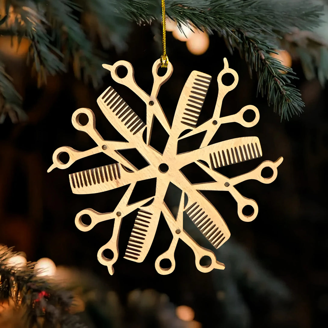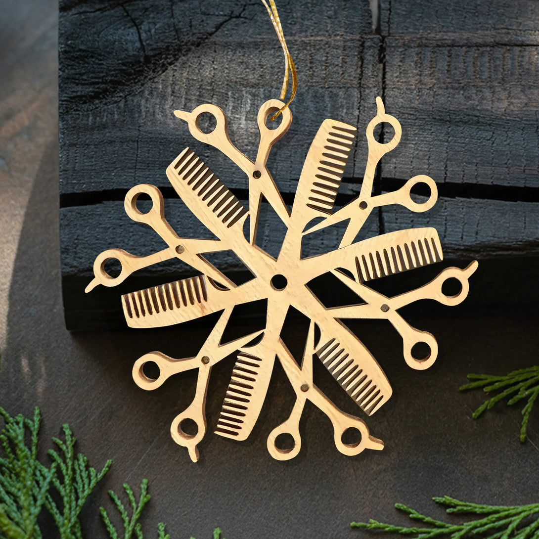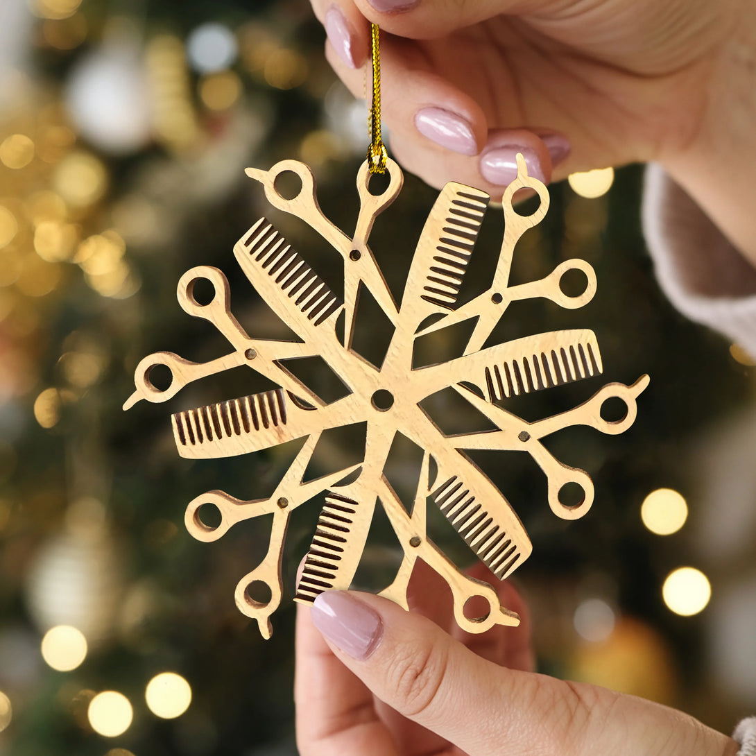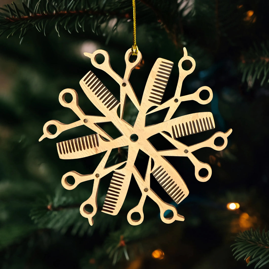 Meticulously crafted in the shape of a snowflake, this ornament beautifully blends iconic hairstylist tools — scissors and combs — into a festive and elegant design. Each detail captures the artistry and passion behind the hairstyling profession, turning everyday tools into a holiday symbol of creativity, care, and transformation.