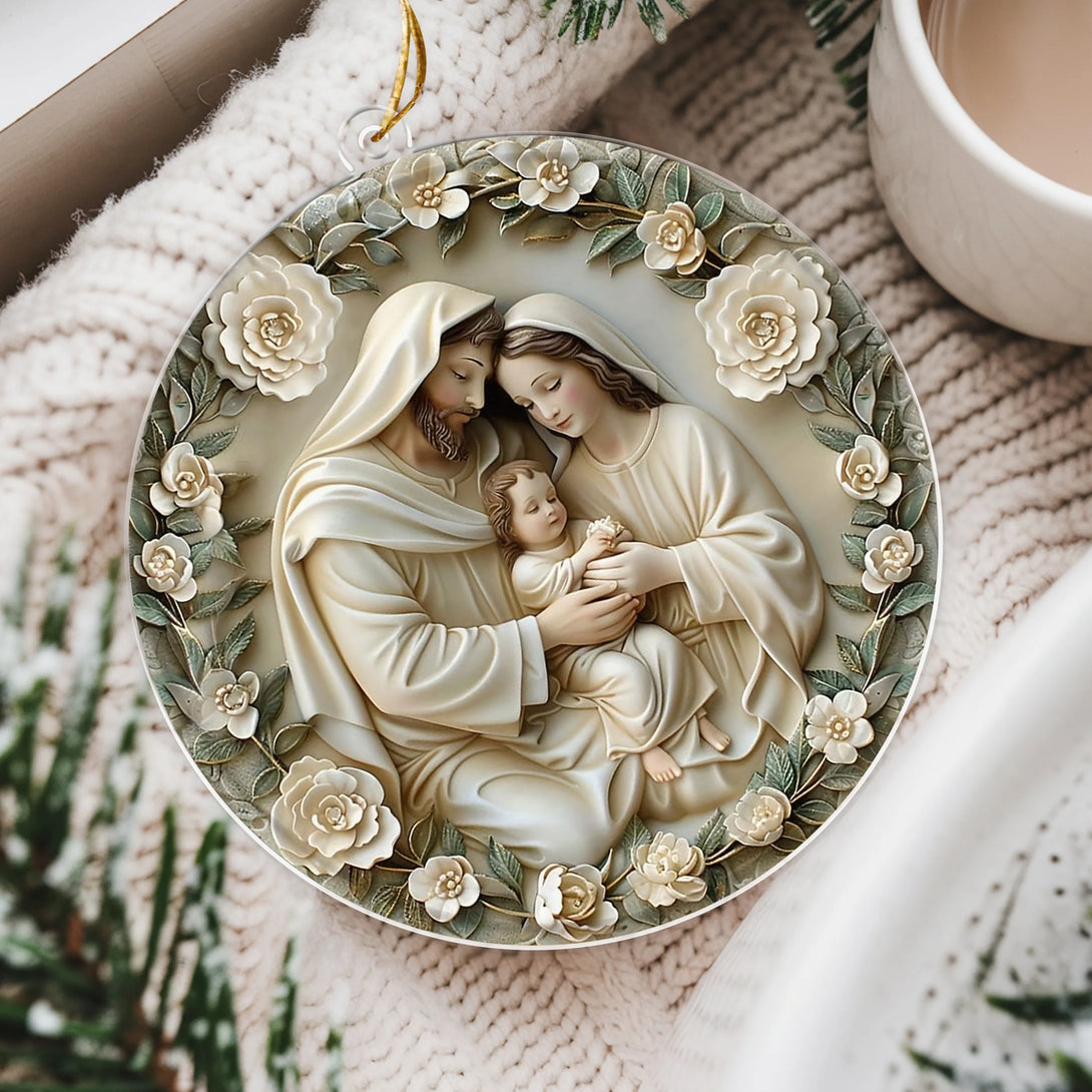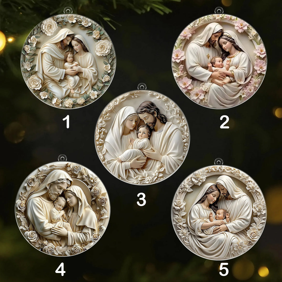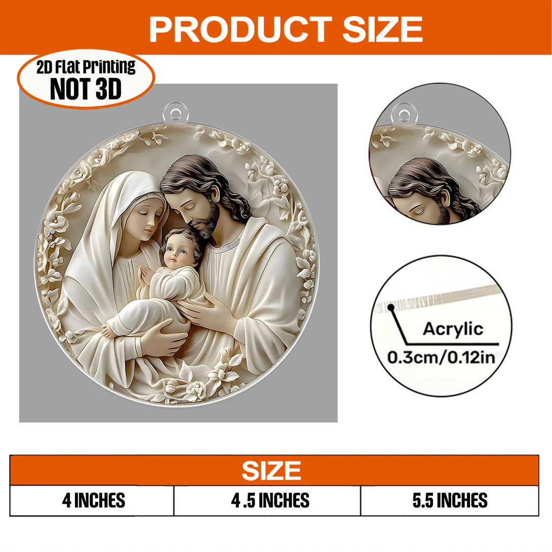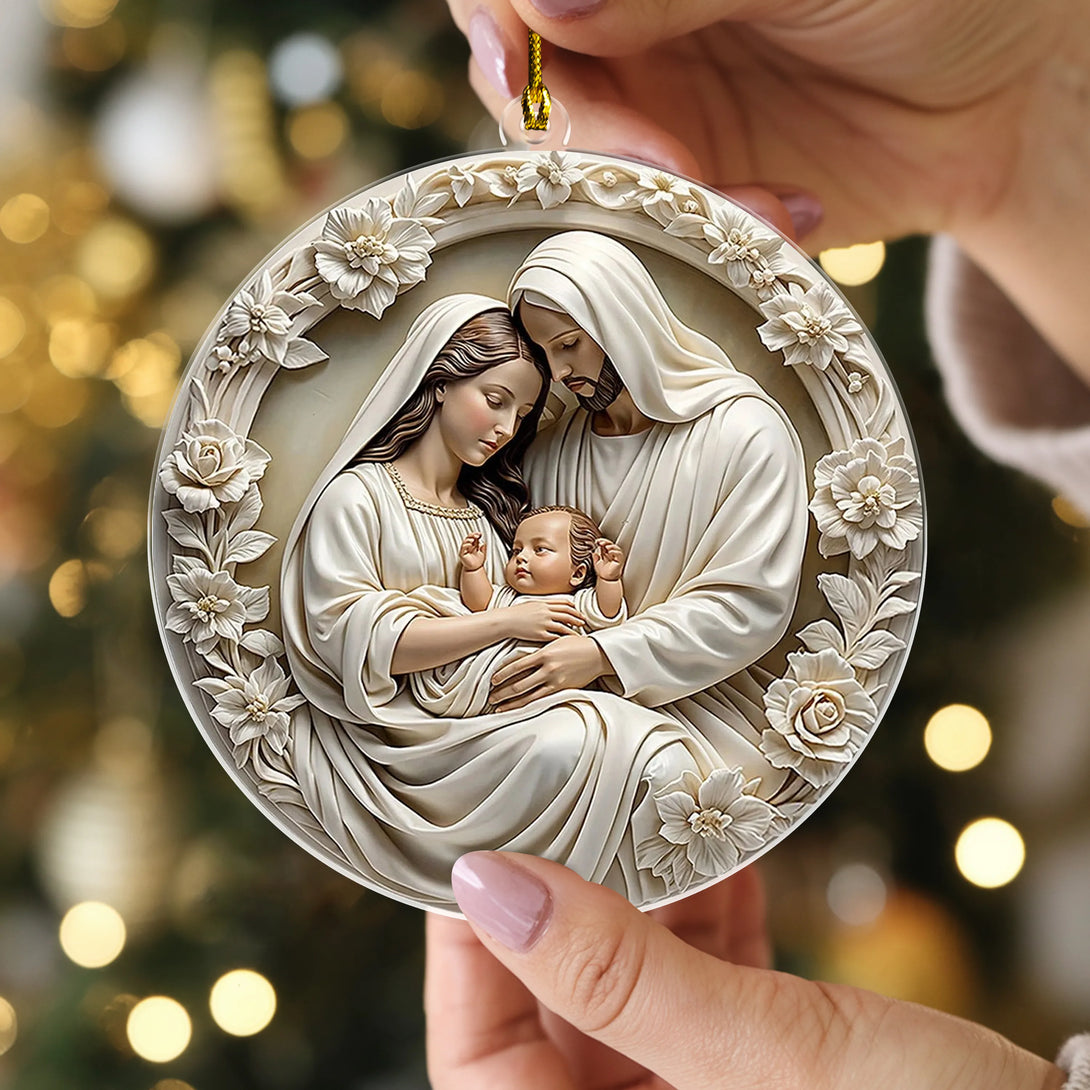 Each ornament is crafted from durable acrylic and designed with a 3D visual effect that gives the artwork realistic depth and texture — appearing almost sculpted when viewed under your Christmas lights. The fine detailing, soft tones, and golden accents make it a truly meaningful addition to your tree or a thoughtful faith-based gift.
