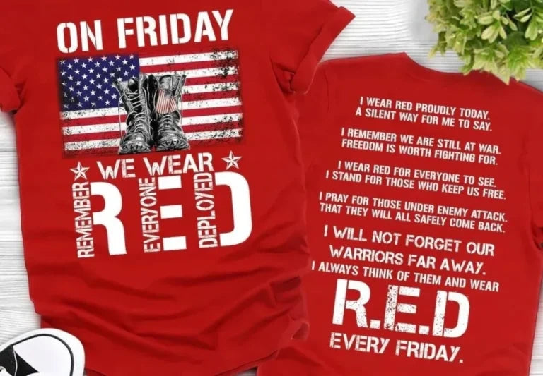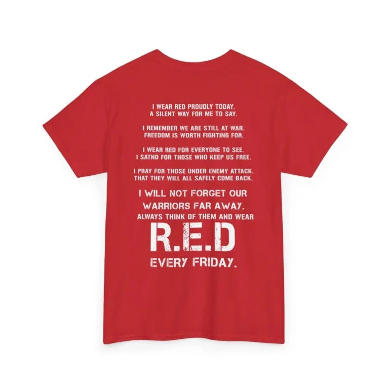 Show your support for our heroes in uniform with this “On Friday We Wear Red – Remember Everyone Deployed” T-shirt.