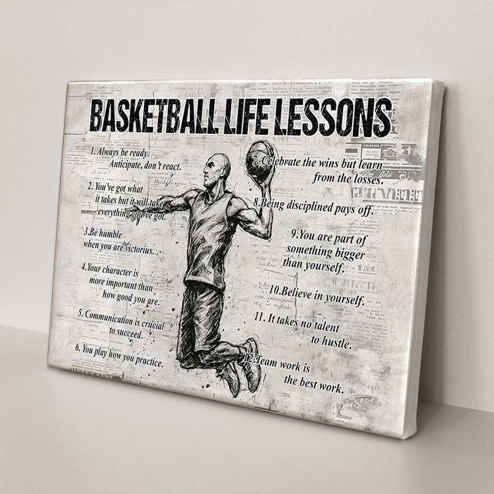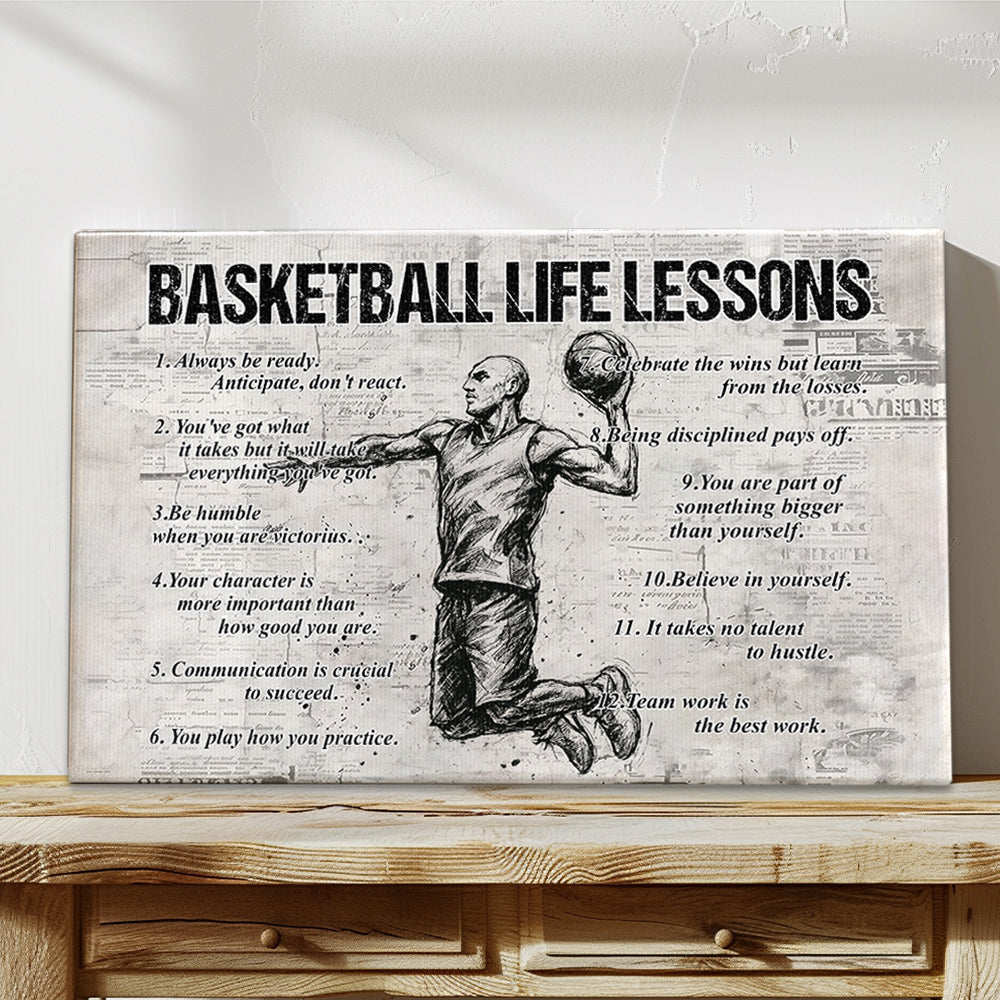 🏀 Featuring the bold quote “Basketball Life Lessons”, this canvas captures the true spirit of the game – skill, passion, and determination.