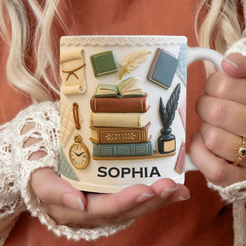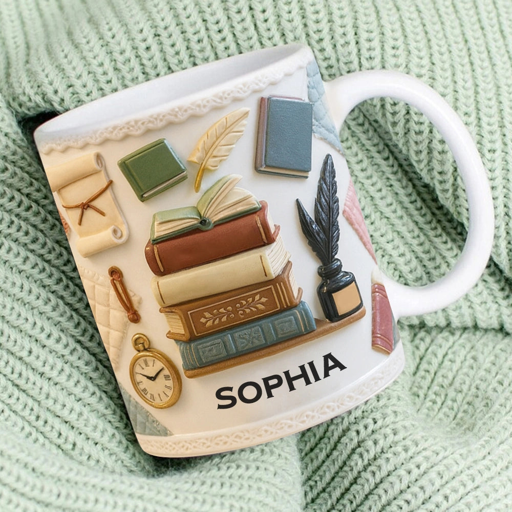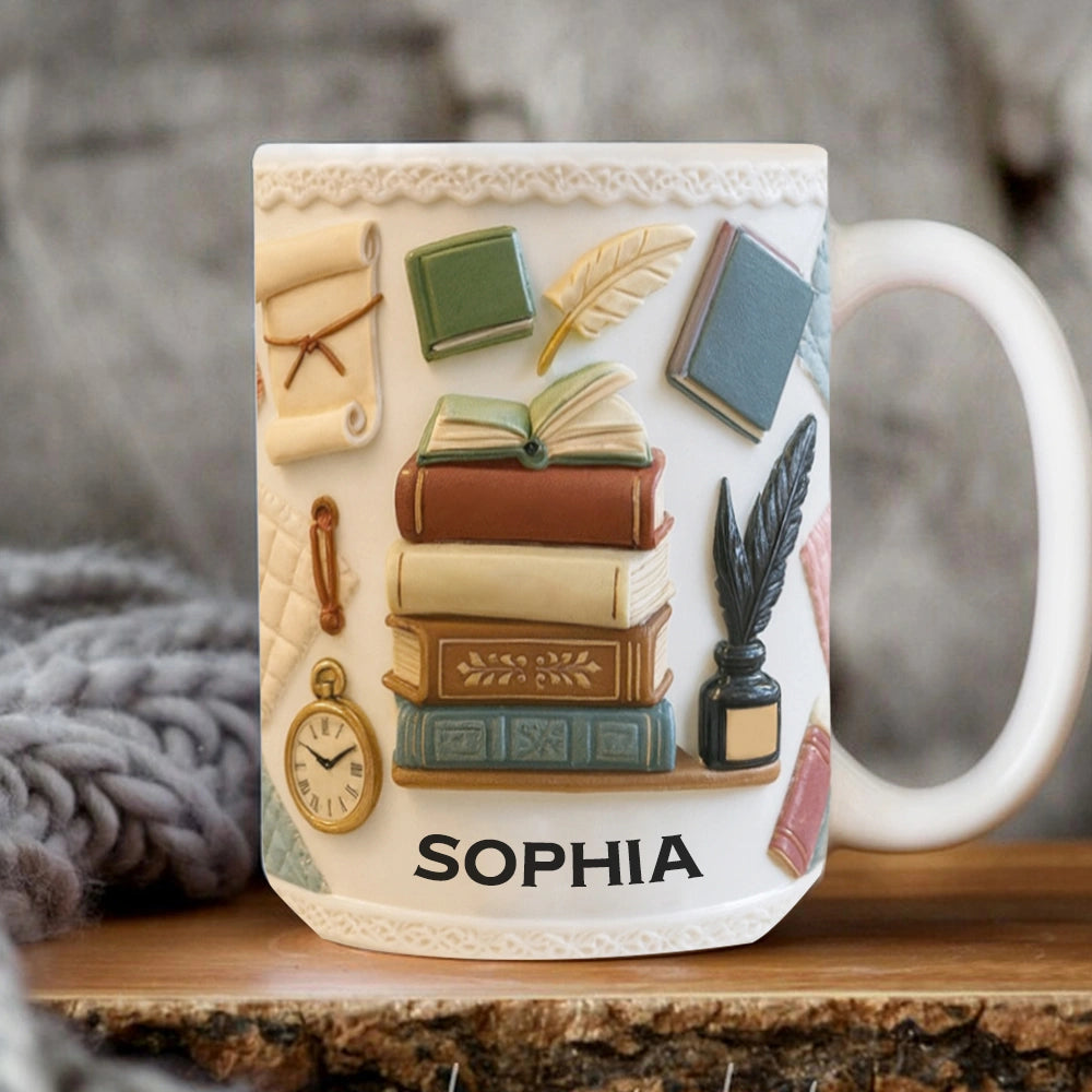 Delight the bookworm in your life with this personalized book lover ceramic mug. Featuring a charming 2D printed design with stacked books, quill, ink, and vintage accents, this mug perfectly captures the love of reading. Add your custom name to make it a one-of-a-kind gift that feels personal and special.
