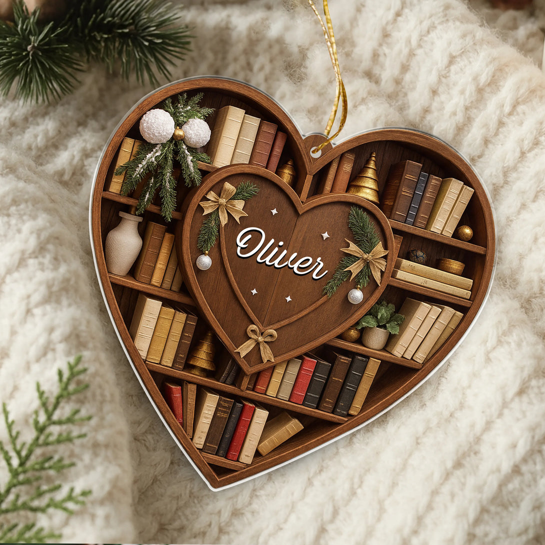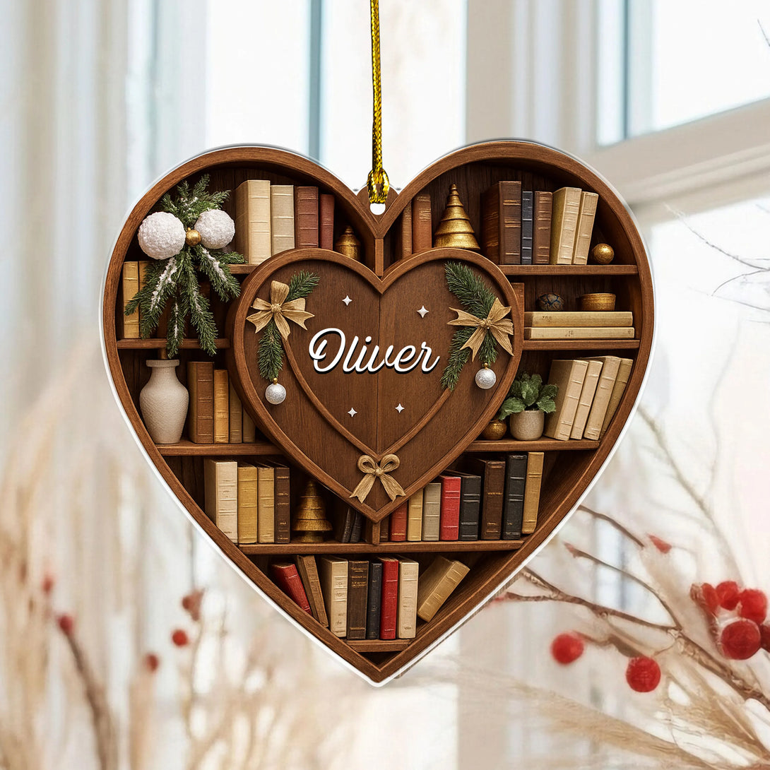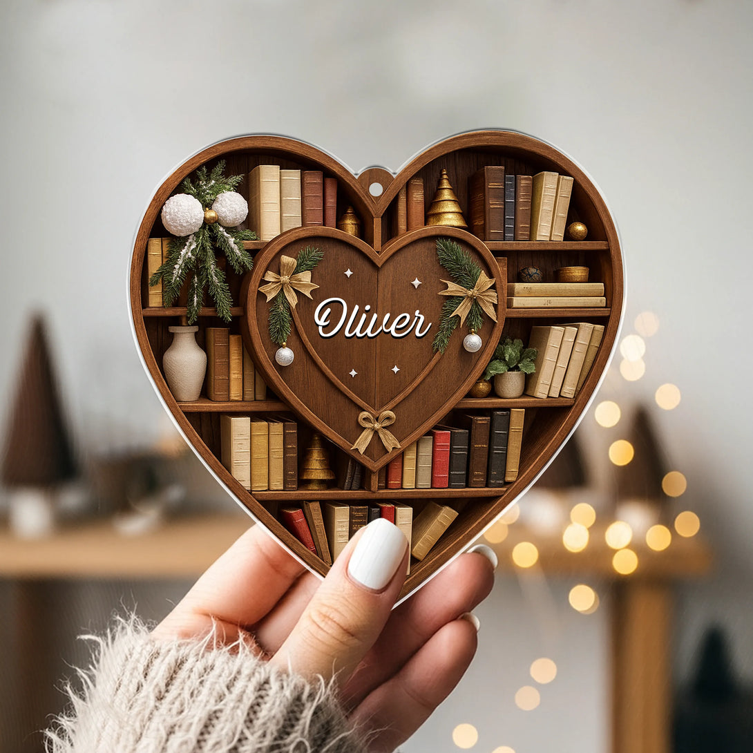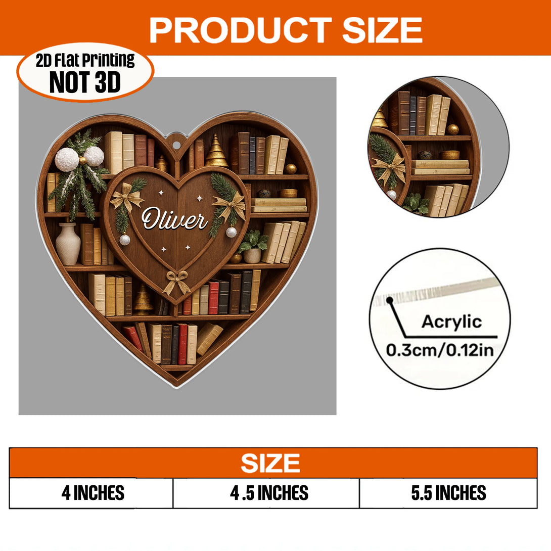 Personalized Bookshelf Heart Ornament – Custom Name 2D Flat Acrylic Christmas Decoration