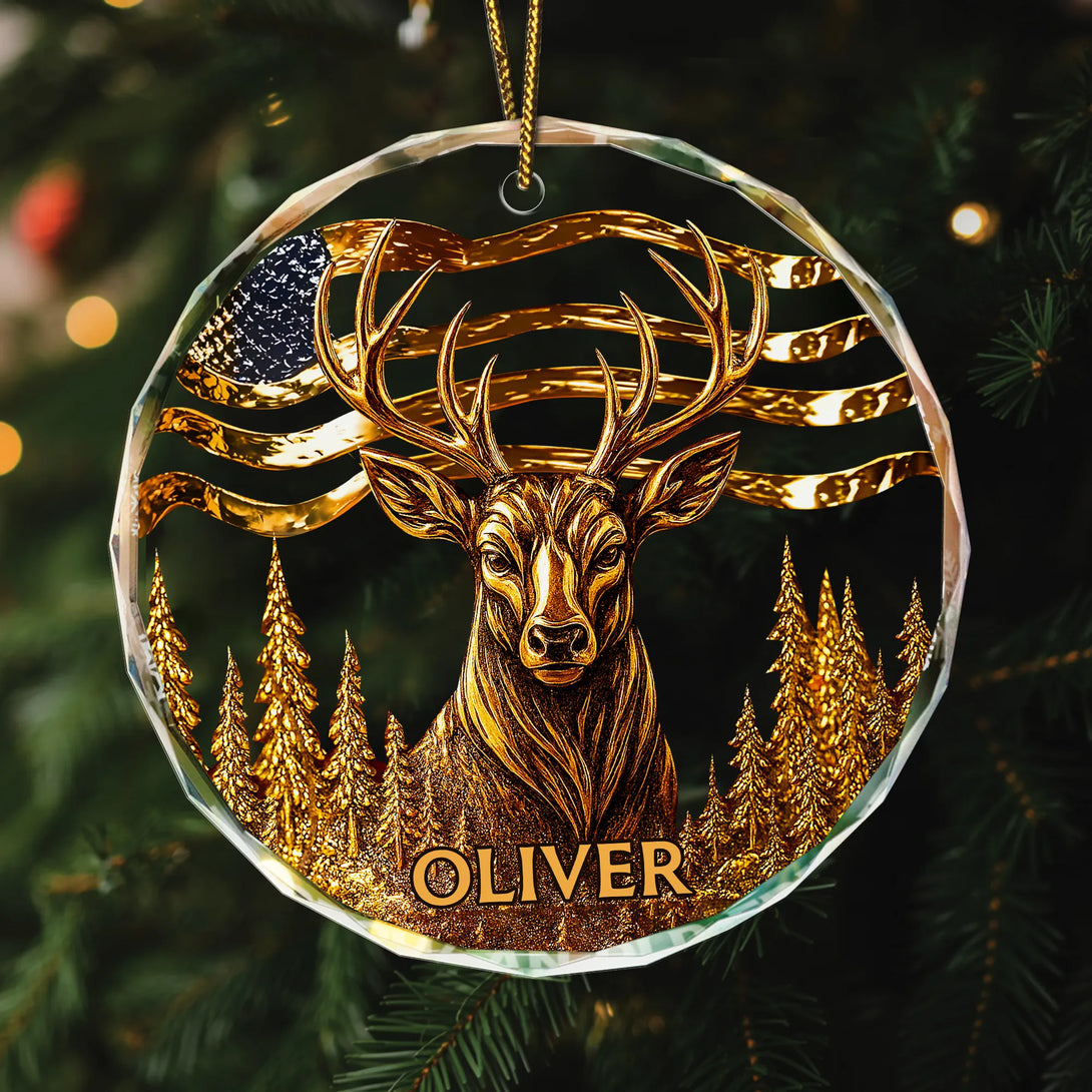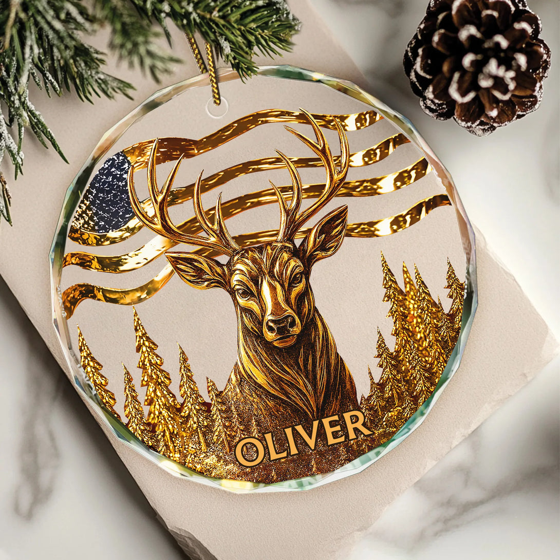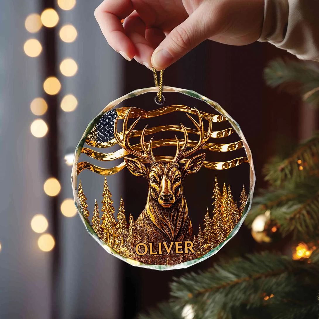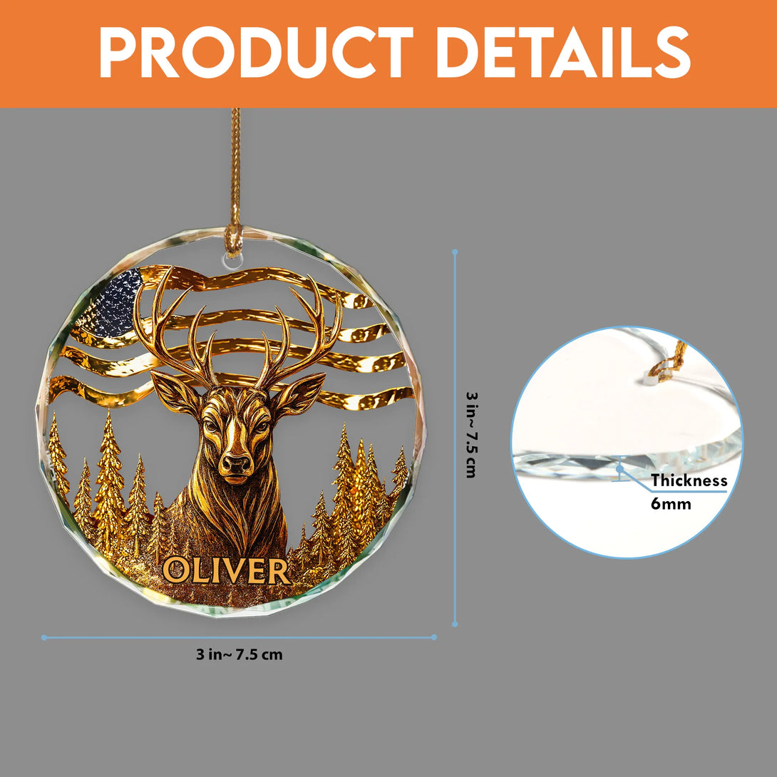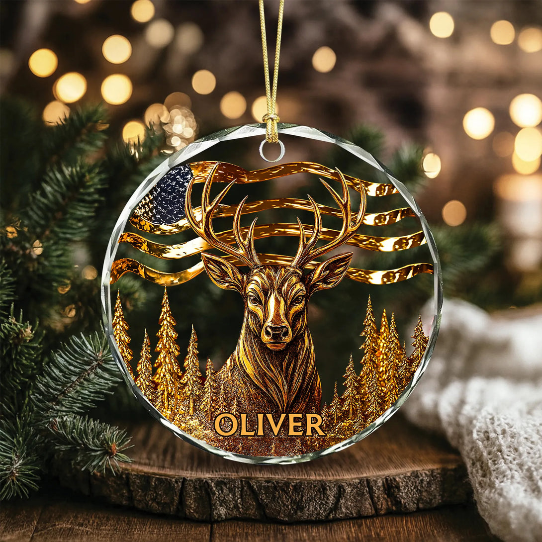 Honor the spirit of the hunt and the beauty of the wild with our Personalized Deer Hunting Golden Effect Circle Glass Ornament. Featuring a magnificent golden deer with detailed antlers set against a shining flag and forest backdrop, this ornament captures the strength, focus, and freedom of a true hunter’s heart. Add your name to create a personalized keepsake that’s both meaningful and timeless.