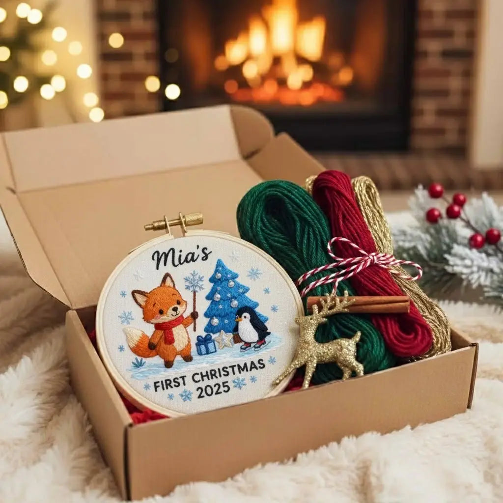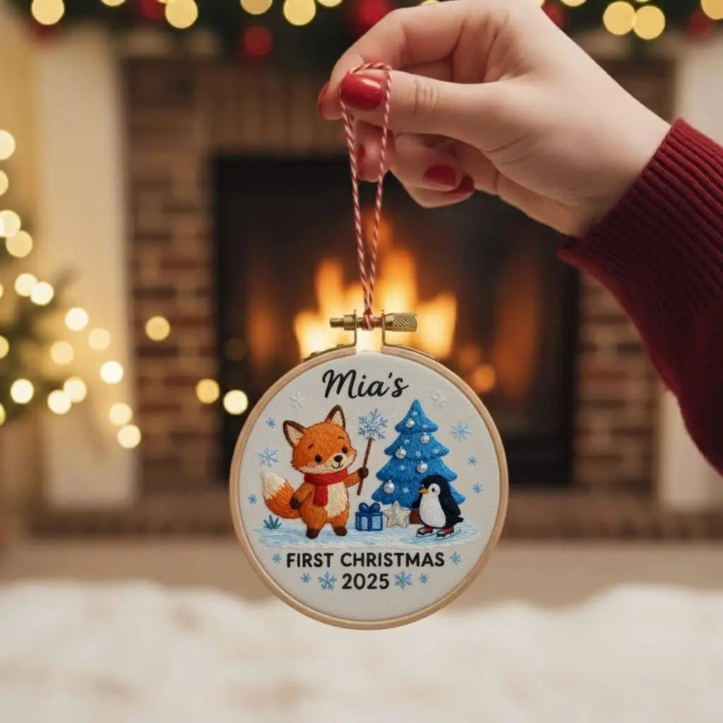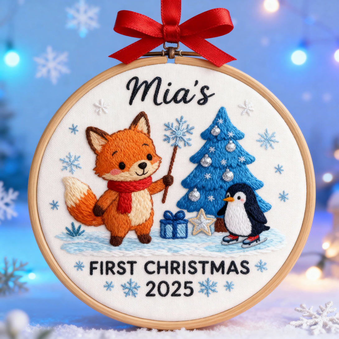 Personalized First Christmas Ornament 2025 β Fox and Penguin Embroidery Design