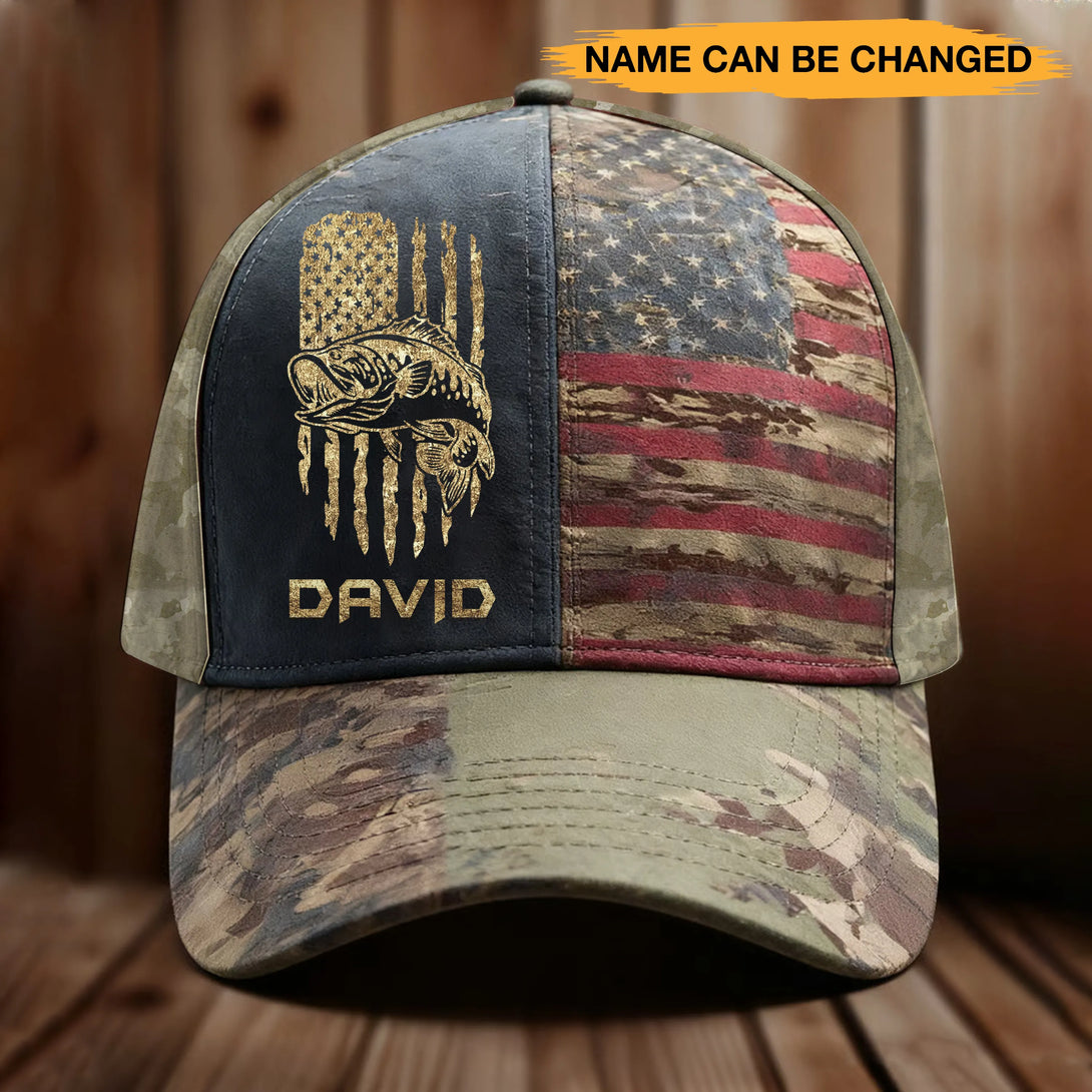Show off your love for fishing and American pride with this Personalized Fishing US Flag Vintage Classic Cap. Featuring a weathered U.S. flag print, detailed fish graphic, and rustic camouflage texture, this cap captures the spirit of freedom and the thrill of the catch.