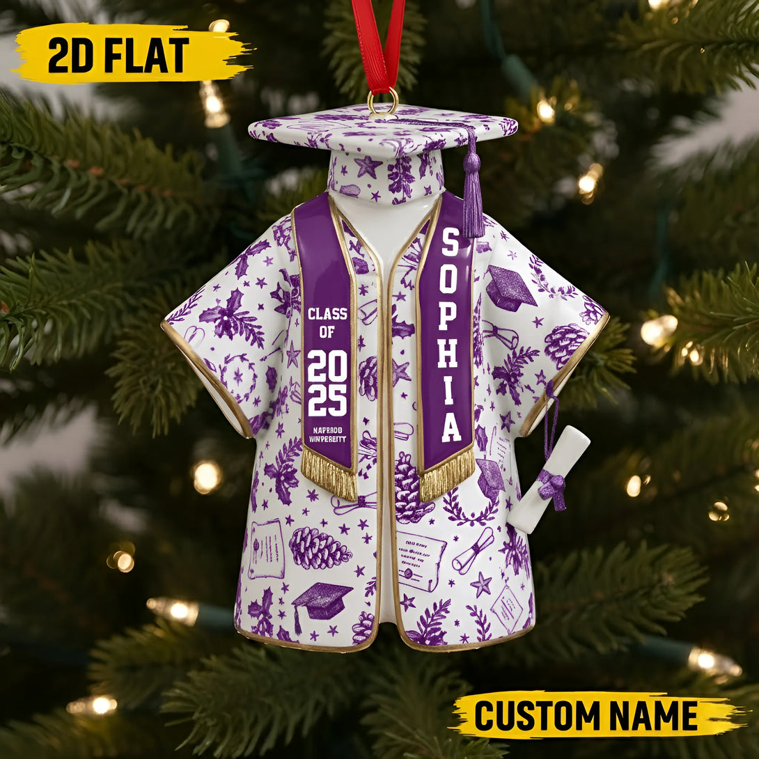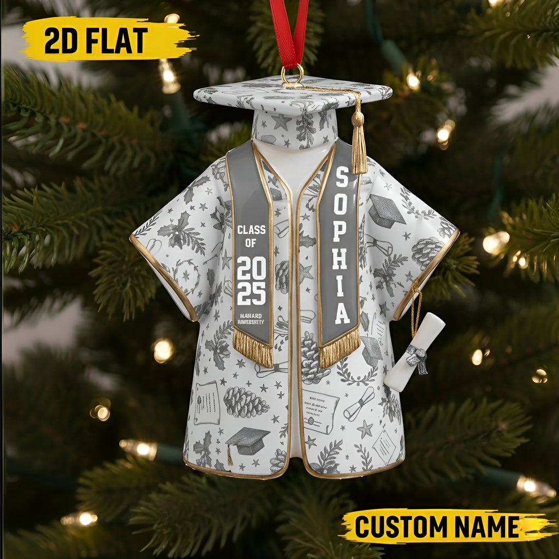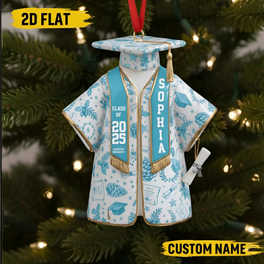 Each piece features a customizable name, class year, and school, making it a unique keepsake to honor academic success. The 2D flat acrylic design showcases vibrant printed details that mimic the depth and charm of a real graduation gown, while keeping the ornament lightweight and easy to hang.