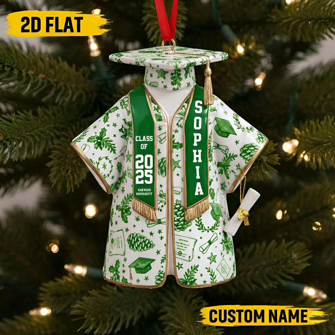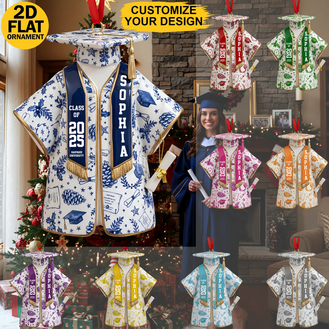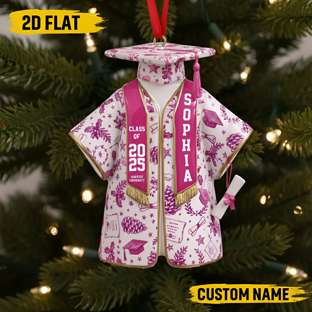 Each piece features a customizable name, class year, and school, making it a unique keepsake to honor academic success. The 2D flat acrylic design showcases vibrant printed details that mimic the depth and charm of a real graduation gown, while keeping the ornament lightweight and easy to hang.