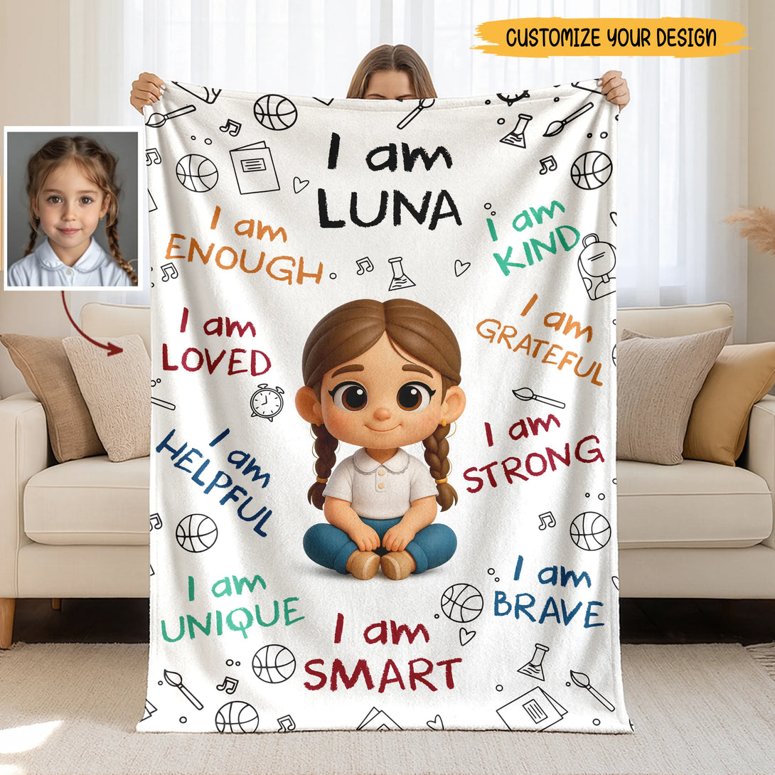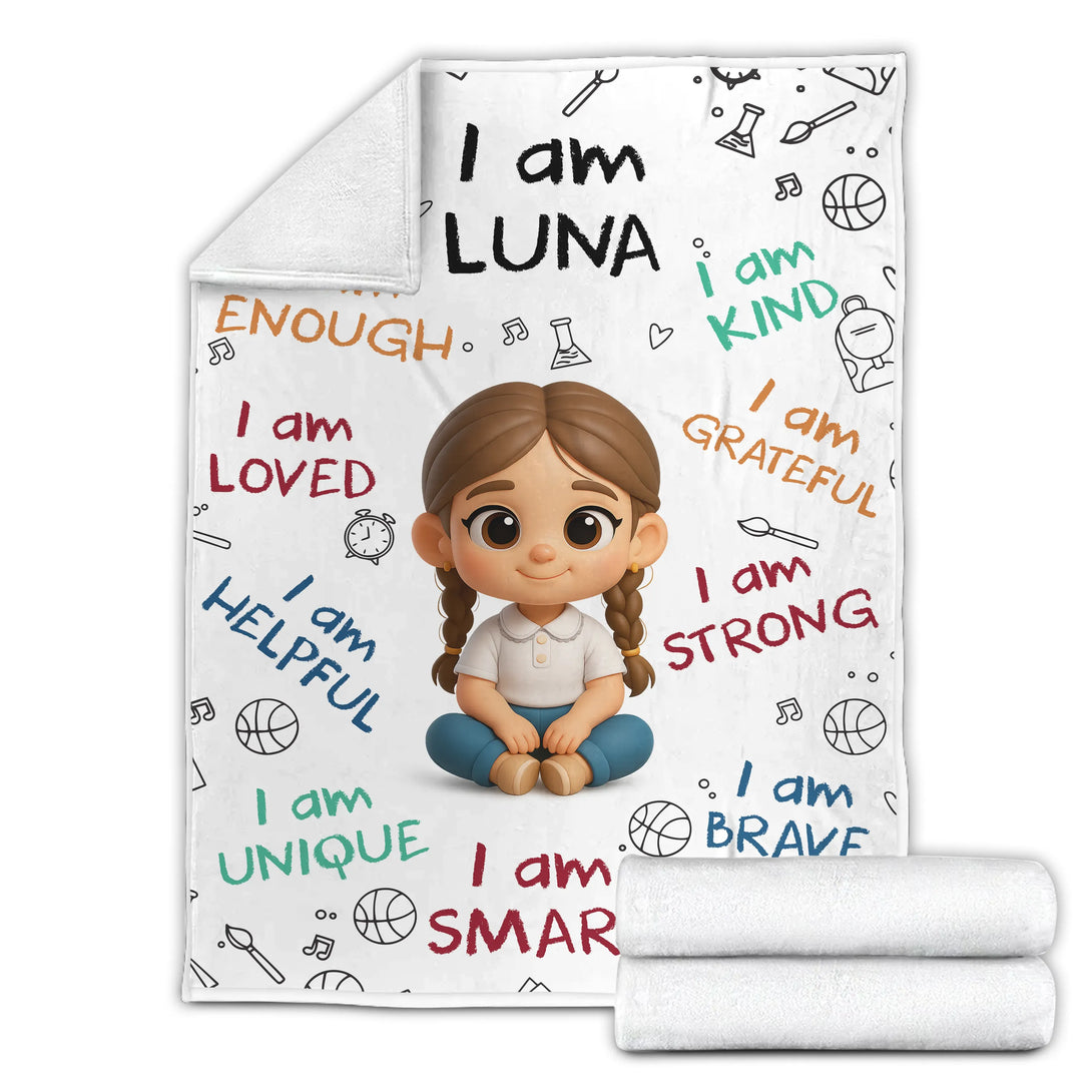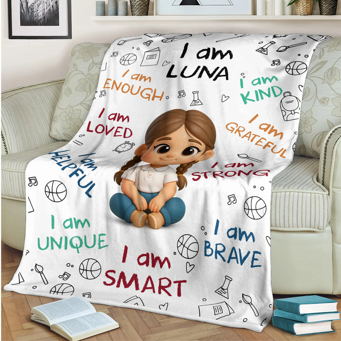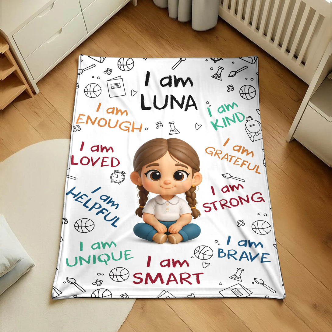 Featuring uplifting phrases like I am enough, I am loved, I am helpful, I am unique, I am smart, and more, this blanket serves as a gentle reminder of strength, kindness, and individuality. Each blanket is customized with your child’s name and portrait illustration, making it a one-of-a-kind keepsake that they’ll cherish for years.