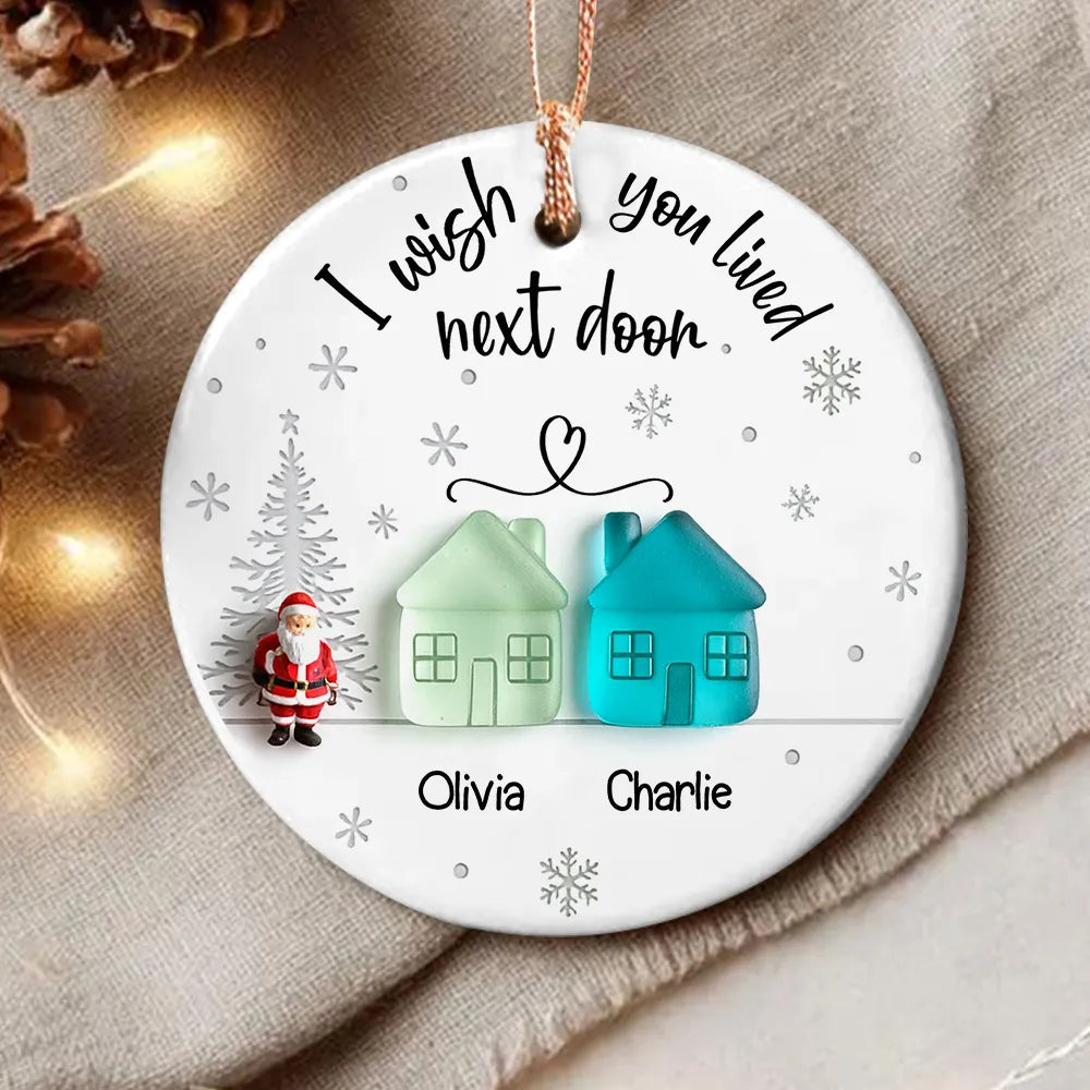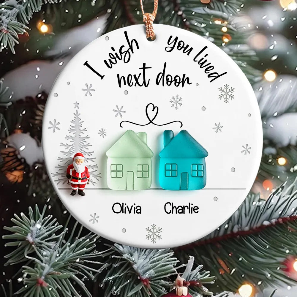 Celebrate the beauty of friendship with our Personalized “I Wish You Lived Next Door” Circle Ornament, a heartfelt keepsake for you and your bestie. Featuring two adorable little houses crafted in a sea glass style design, this ornament perfectly symbolizes the wish to always be close, no matter the distance. The playful snowy details and festive Santa accent make it a charming addition to any Christmas tree.