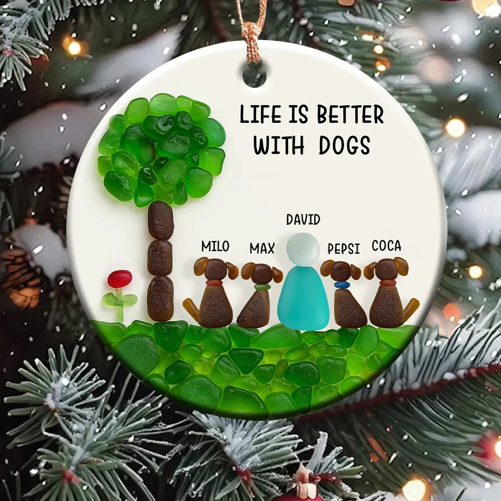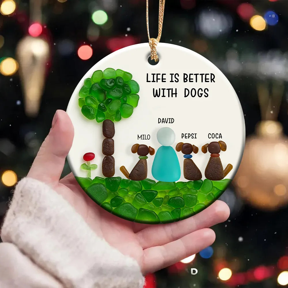 Celebrate the joy of furry friends with this charming Personalized “Life Is Better with Dogs” Sea Glass Ceramic Ornament. Featuring an artistic sea glass-style design with a tree, pets, and a customizable family scene, this ornament makes a heartwarming addition to any Christmas tree.