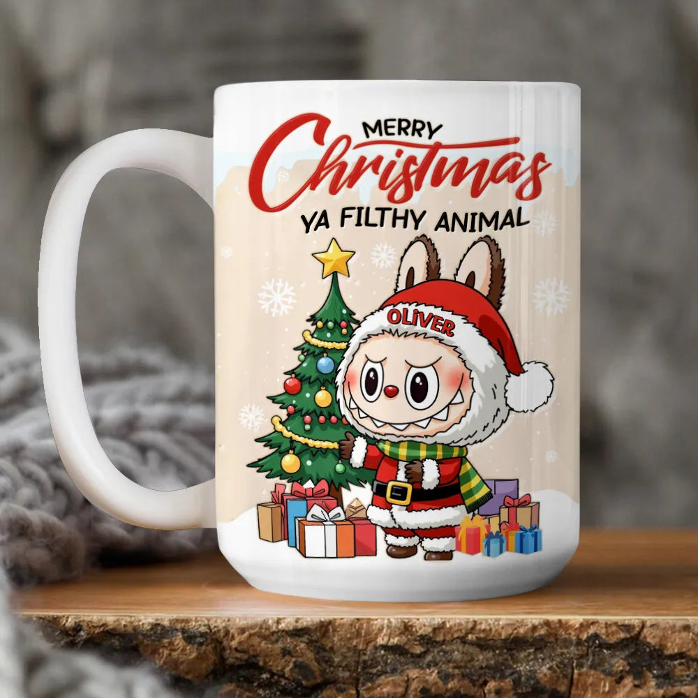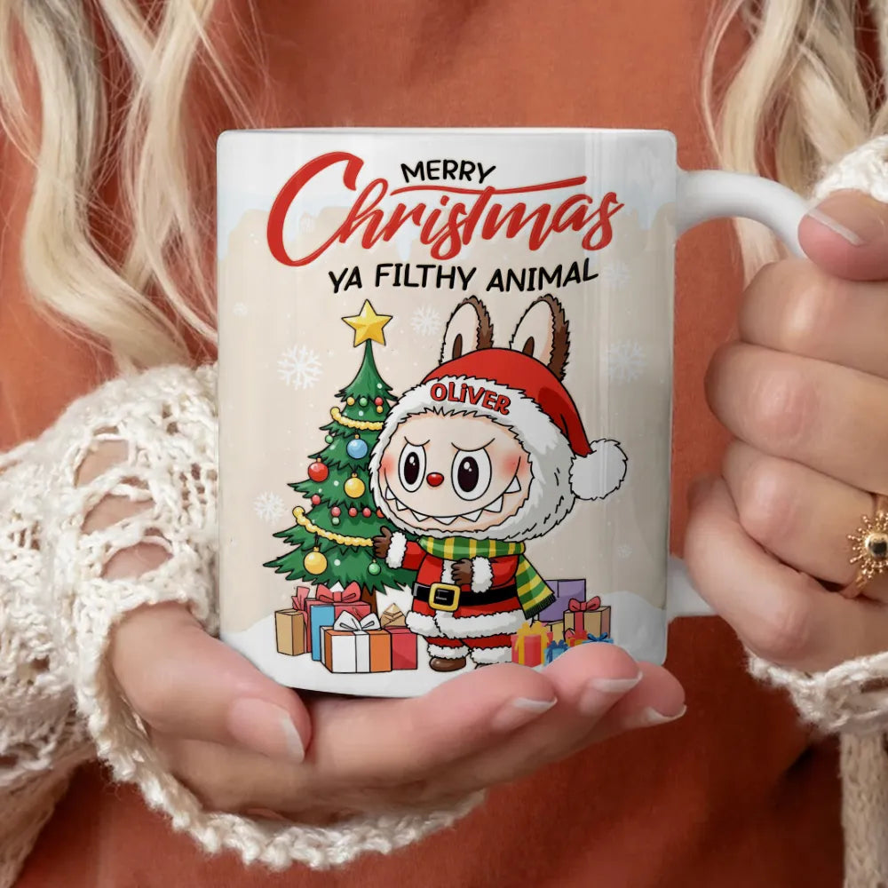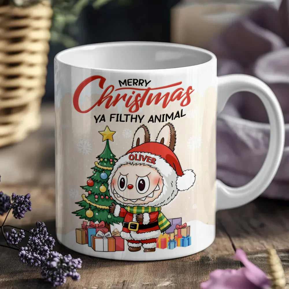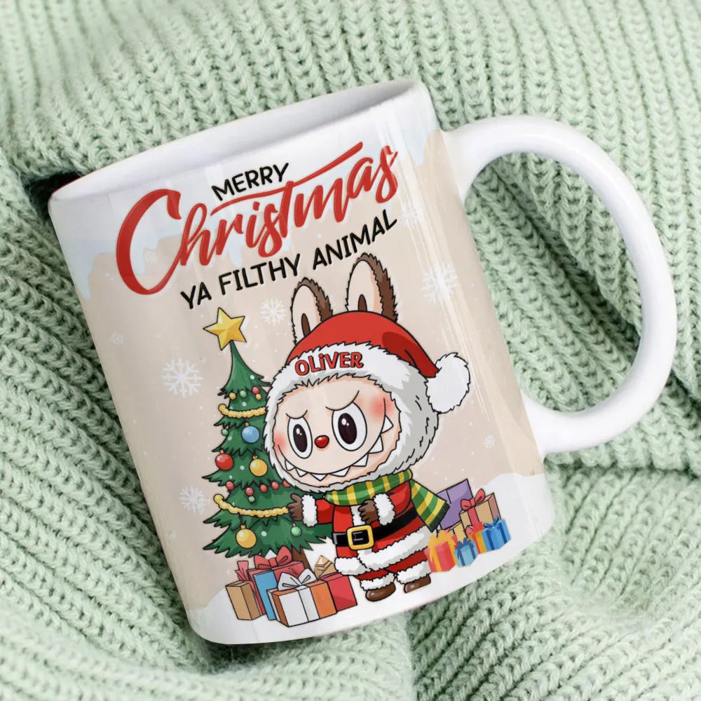 Bring laughter and festive cheer to your mornings with this Personalized “Merry Christmas Ya Filthy Animal” Mug! Featuring a cute chibi-style Christmas character, this mug makes every sip a joyful reminder of holiday fun. Add your name to make it truly yours - or surprise someone special with a one-of-a-kind Christmas gift!