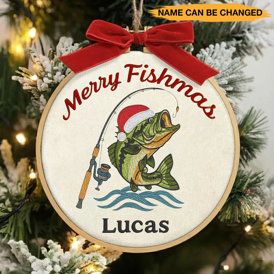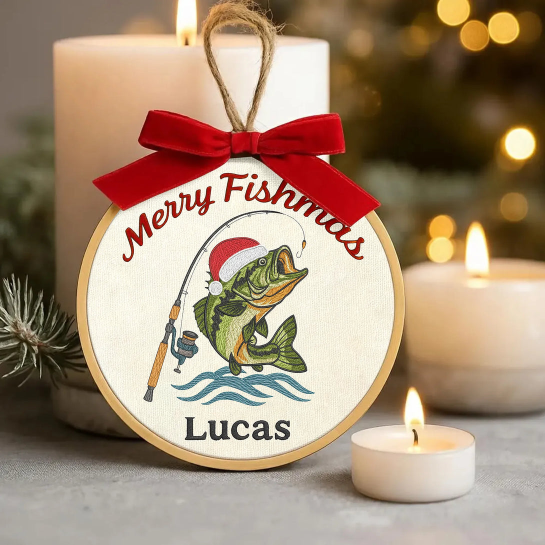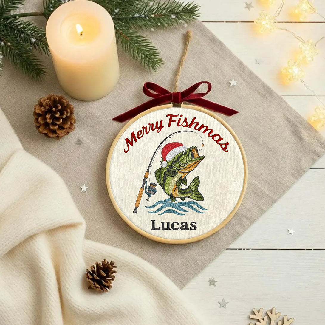 Personalized Merry Fishmas Embroidered Ornament, Unique Gift for Fishermen & Fishing Lovers