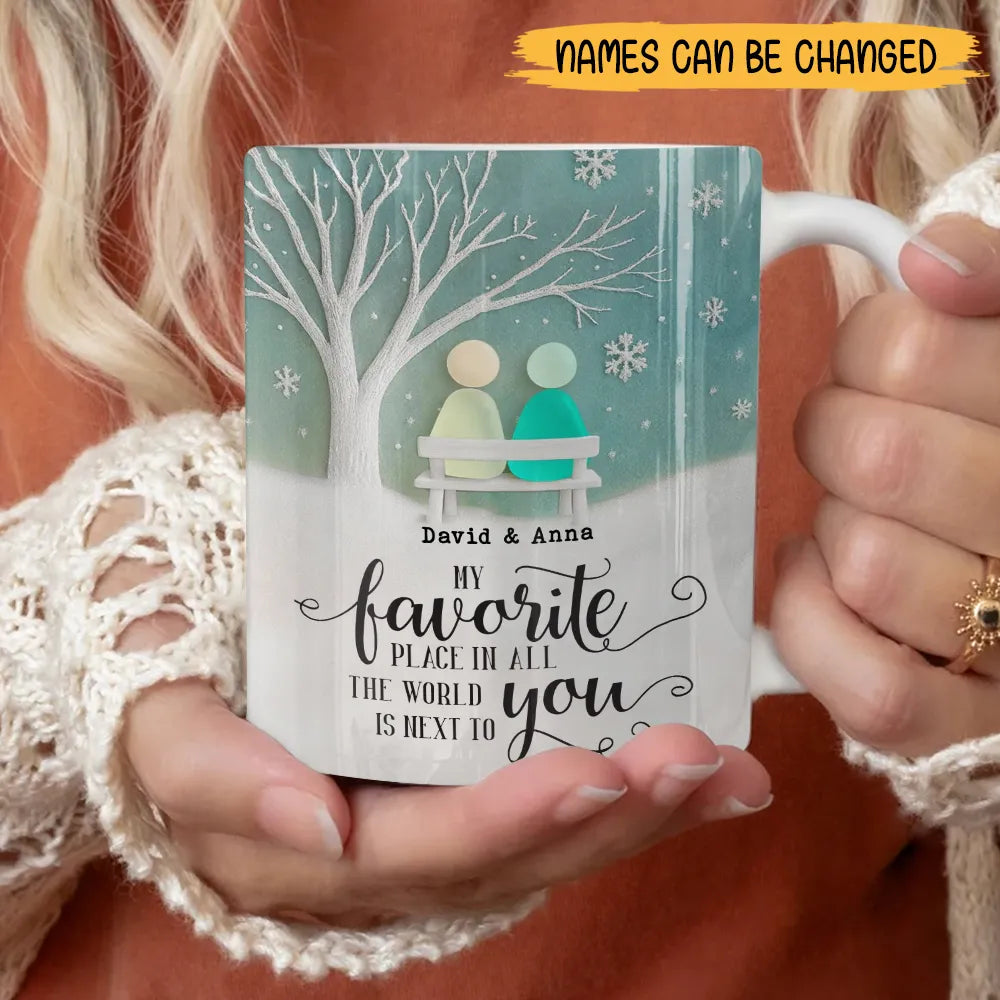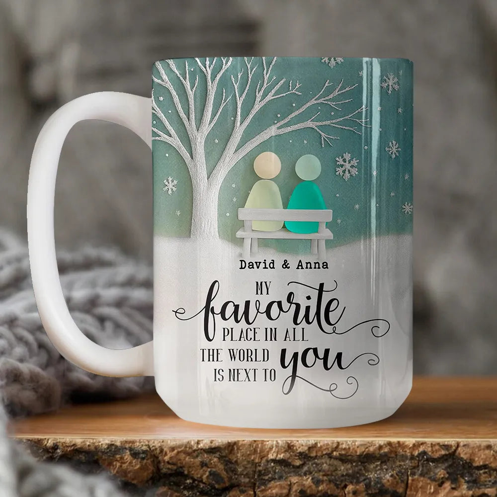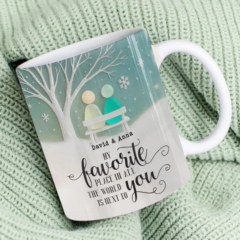 Start your mornings with love and warmth with this personalized sea glass couple heart ceramic mug. Featuring the heartfelt quote “My Favourite Place In All The World Is Next To You”, this charming mug is the perfect way to celebrate your special bond with someone you love.