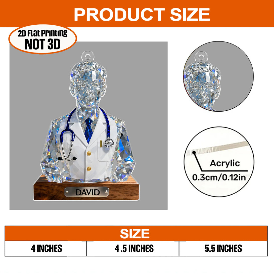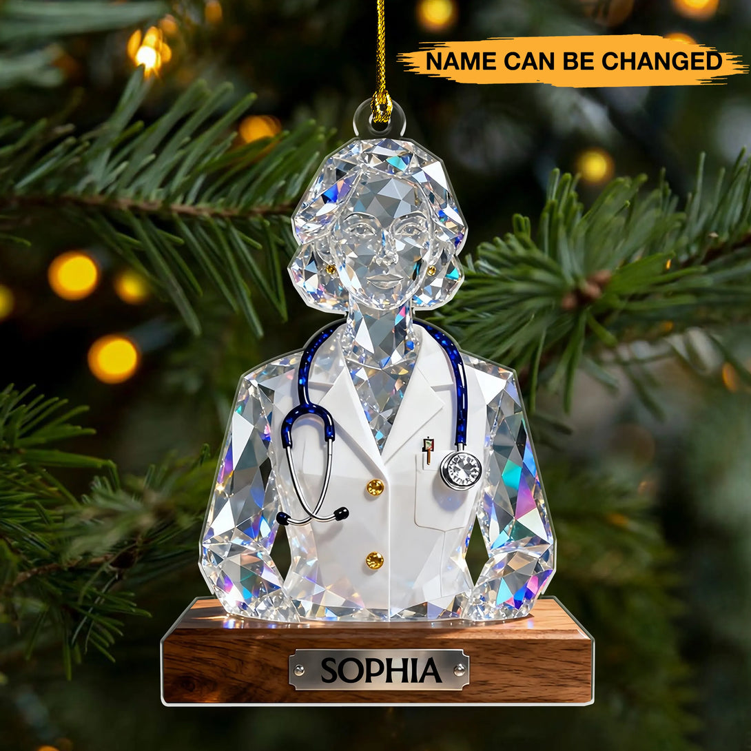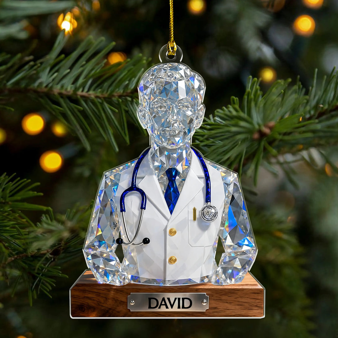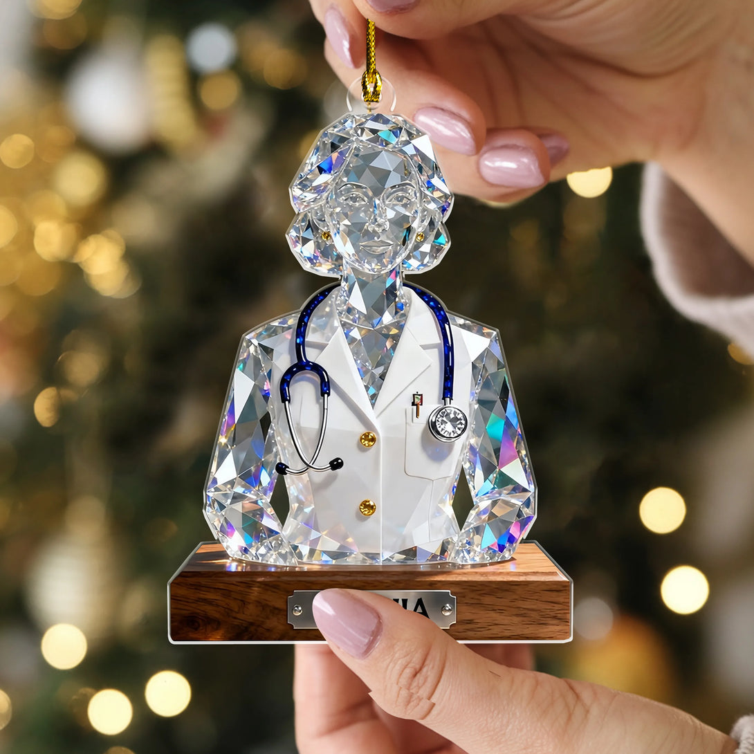 This ornament features a realistic 3D stained-glass stethoscope design, shimmering like crystal under holiday lights, and sits atop a wood-look base with a customizable nameplate. Each piece celebrates the heart and commitment of doctors, nurses, and medical professionals who bring care and comfort every day.