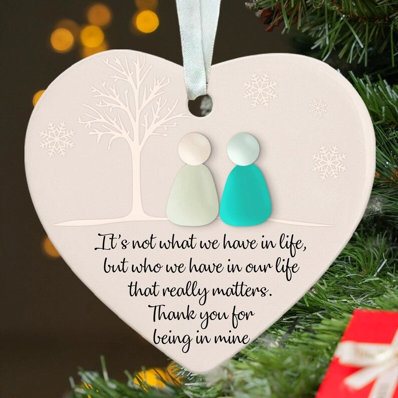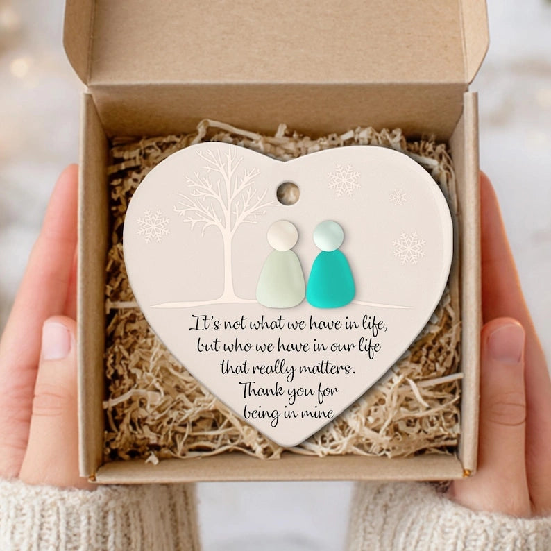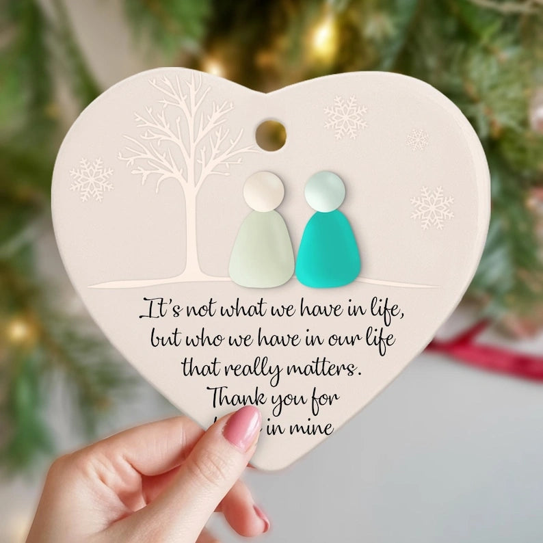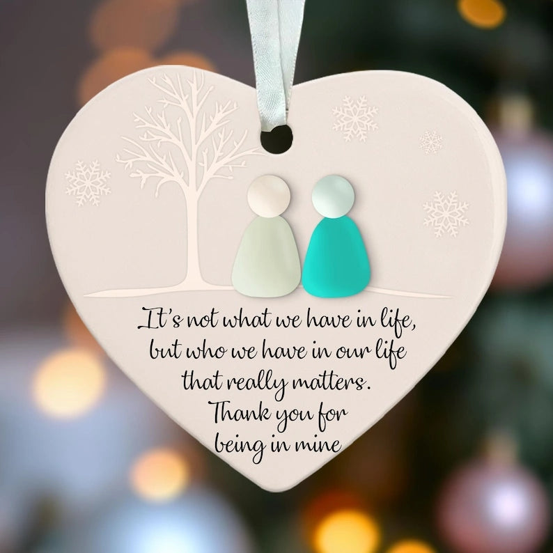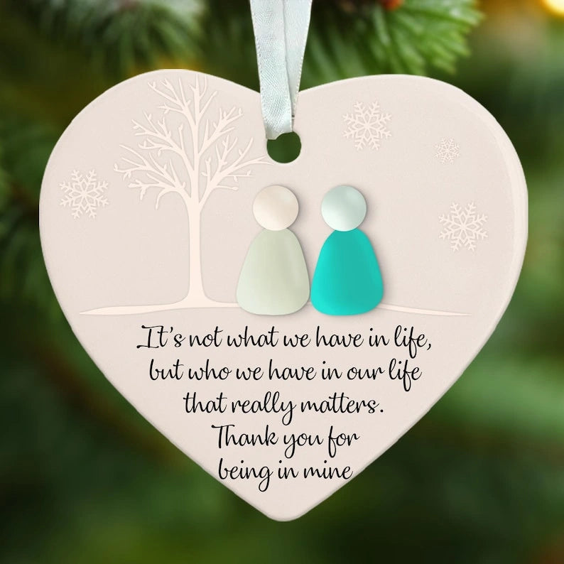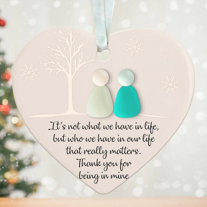 Celebrate love, friendship, and meaningful connections with this personalized heart-shaped ceramic ornament. Designed with a beautiful sea glass style and engraved with the heartfelt quote: “It’s not what we have in life, but who we have in our life that really matters. Thank you for being in mine.”