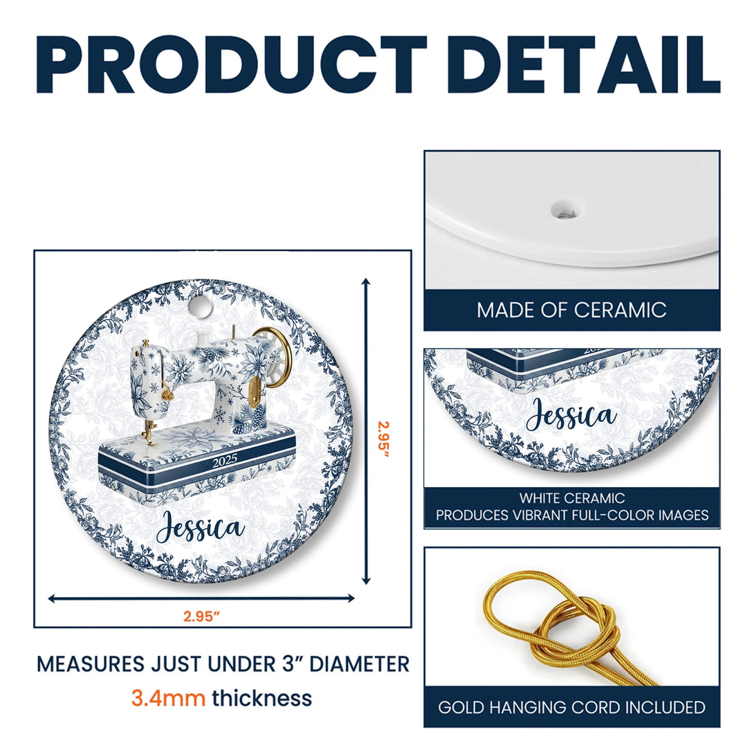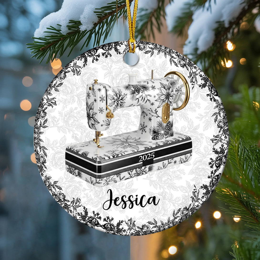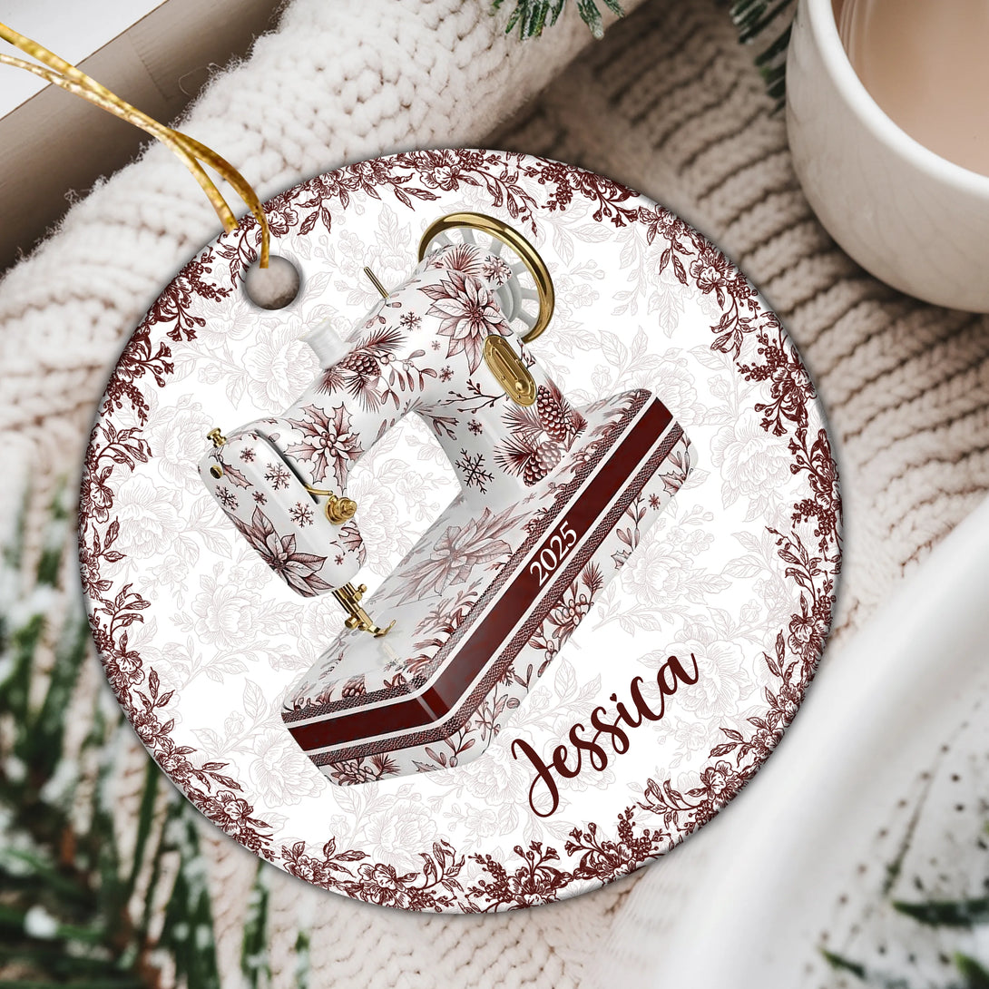 Celebrate the artistry of sewing with this Personalized Sewing Lover Toile De Jouy Ceramic Ornament. Featuring an elegant vintage-inspired sewing machine design with floral patterns, this ornament adds a timeless touch to your holiday tree.