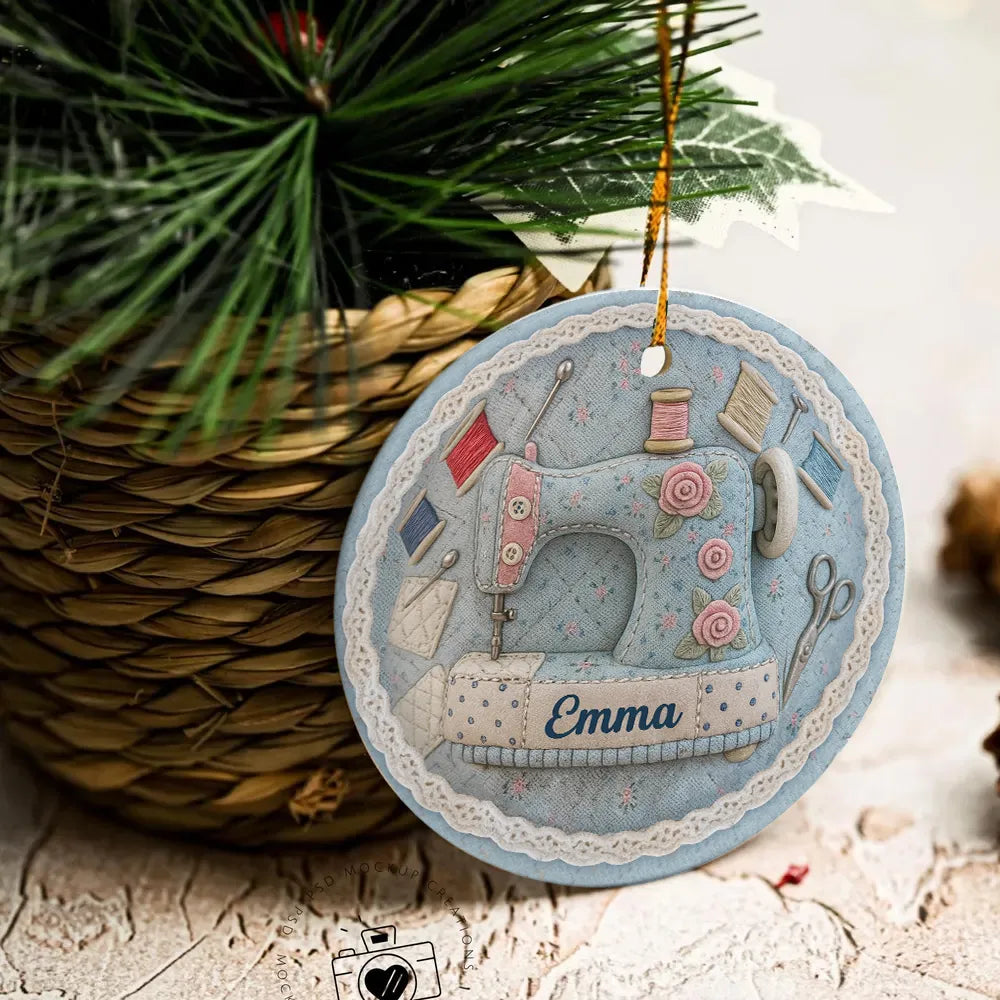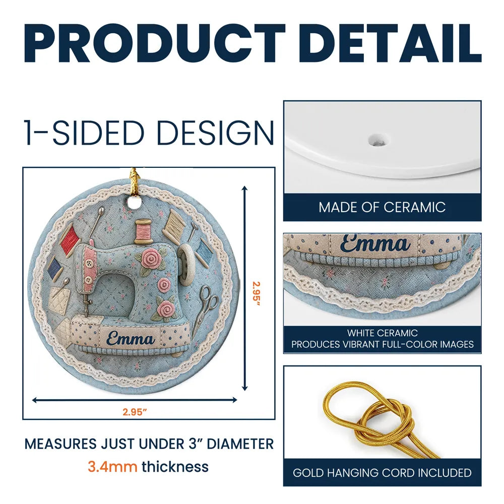 Celebrate your love for sewing with this Personalized Vintage Sewing Machine Circle Ceramic Ornament. Featuring a beautifully illustrated sewing machine surrounded by spools of thread, scissors, and floral details, this ornament is designed in a charming vintage style that adds warmth and creativity to your holiday décor.