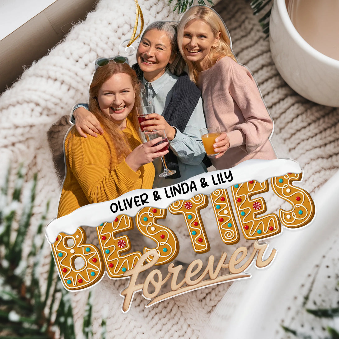 Celebrate the bond that lasts forever with this custom photo “Forever” gingerbread ornament! Whether it’s for best friends, sisters, or siblings, you can upload your favorite photo and names to create a one-of-a-kind holiday keepsake. The design features festive gingerbread-style lettering with a snow accent and a warm 3D acrylic effect that makes your ornament shine on the Christmas tree.