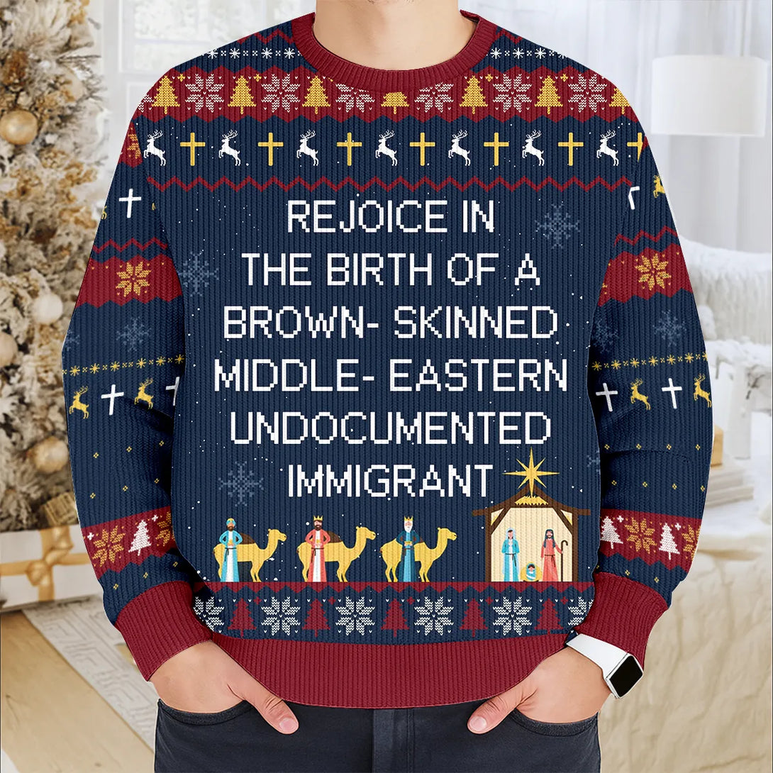 Get ready to be the life of the party with this Rejoice In The Birth Of A Brown-Skinned Middle-Eastern Undocumented Immigrant Sweater! Featuring a festive holiday design with playful humor, it’s the perfect ugly sweater for Christmas gatherings, office parties, or themed celebrations. Made from soft, cozy knit material for all-day comfort. A hilarious and unforgettable gift for anyone who loves a good laugh during the holidays.