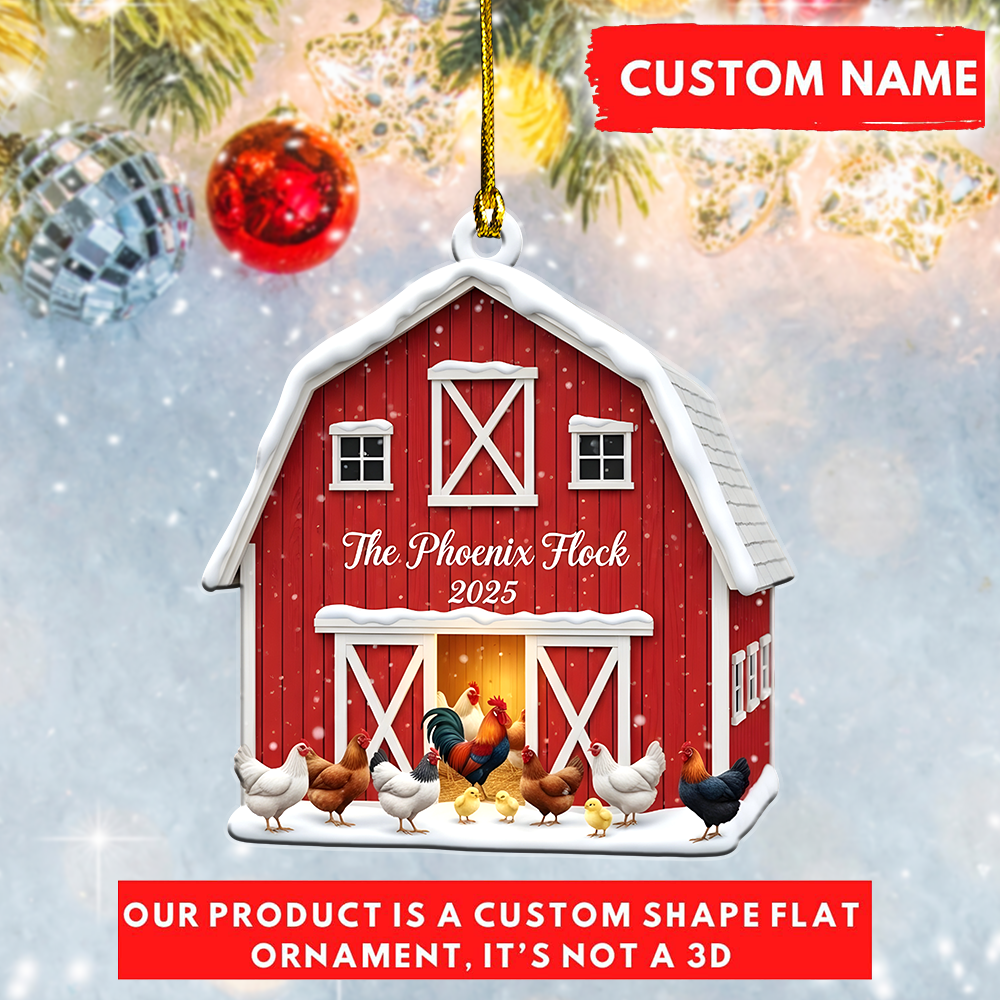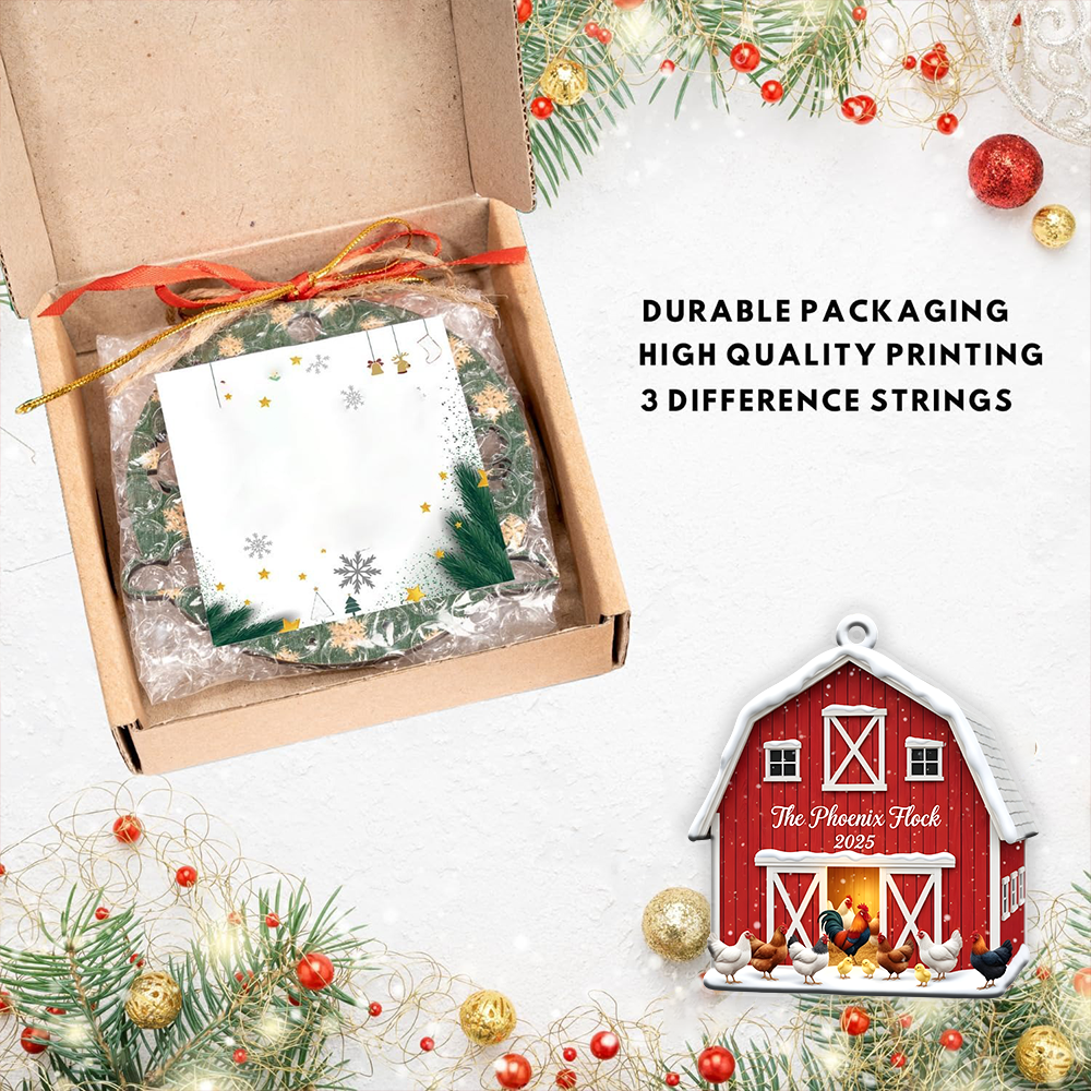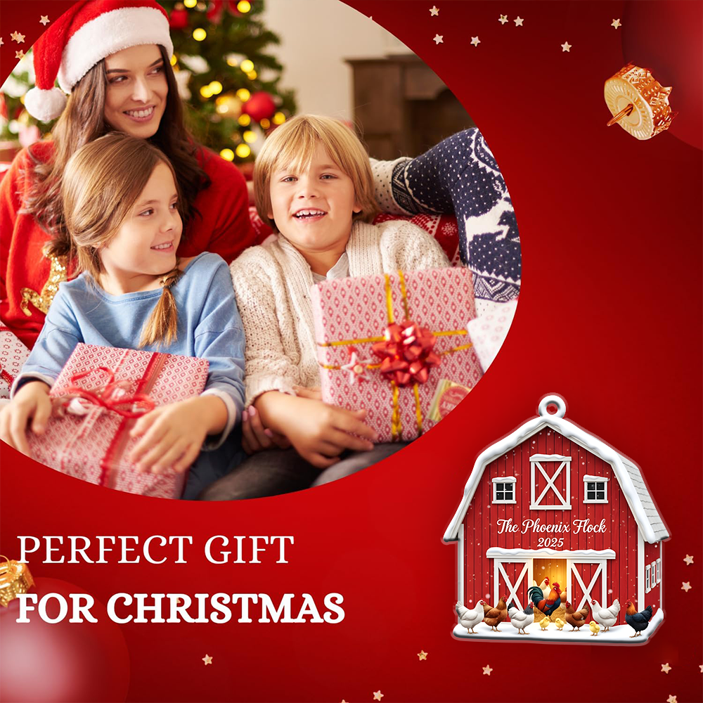 Rustic Farmhouse Red Barn Ornament 2025 - Personalized Christmas Decoration With Chickens, Roosters & Hens, Holiday Home Keepsake